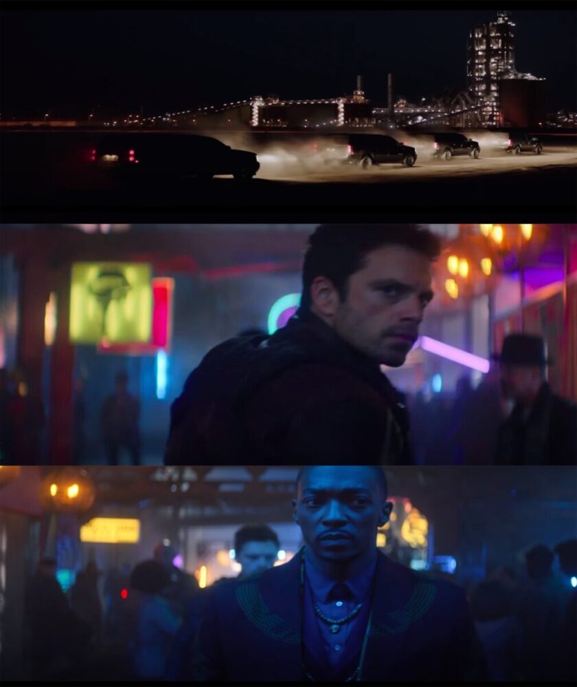 Łącząc kilka innych ujęć, można wywnioskować z bardzo dużym prawdopodobieństwem, że Sam i Bucky będą przez kogoś ścigani (typowe czarne rządowe pojazdy). Idąc przez miasto ewidentnie wyglądają na mocno zaniepokojonych i oglądają się za siebie. Kto ich prześladuje? Czy to ludzie generała Thaddeusa Rossa? Mogą ich ścigać m.in. ich za niepodpisanie traktatu z Sokovii, a może faktycznie zabrali tarczę Kapitana Ameryki?