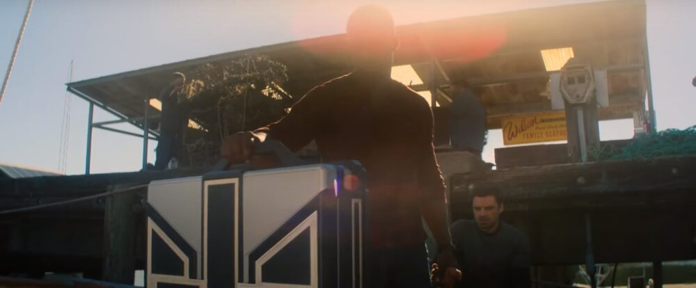 Kolejne sceny to widok na dom oraz Sam i Bucky, którzy gdzieś płyną. Wygląda na to, że zmierzają do nadmorskiego domu Sama lub członka jego rodziny. Warto zwrócić uwagę na na tabliczkę z napisem „Wilson Family Seafood”. Jednak według mnie najciekawszym kadrem z tej sceny jest Sam trzymający dość tajemniczą skrzynie. Czy właśnie w niej trzyma Tarczę Kapitana Ameryki? Czy to po prostu skrzynia z kostiumem Falcona? Tego nie jesteśmy pewni. Póki co musimy uzbroić się w cierpliwość i poczekać, aż otworzą ją w jednym z odcinków.