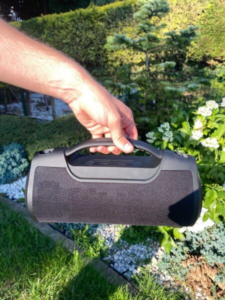 Membrany pasywne znajdują się po boku i mają standardowy, typowy dla głośników takiej budowy wygląd. Port ładowania znajdziemy z tyłu i zdecydowanie jest on schludnie wkomponowany w całość urządzenia. Jedyny aspekt, do którego można mieć zarzuty, to fakt, iż odciski palców zostają na głośniku i w mocniejszym świetle są dostrzegalne. Nie jest on też najlżejszy, jednak decydując się na model o takich gabarytach powinniśmy się liczyć z taką wagą.