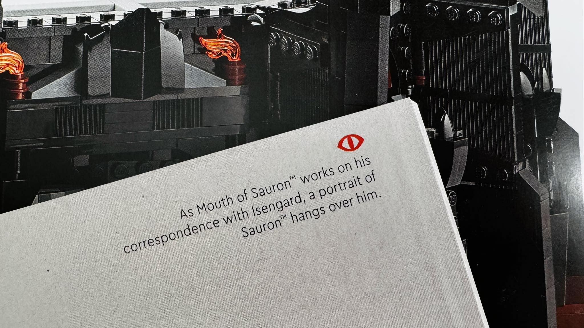 Podczas składania zestawu mamy idealną okazję, by ponownie obejrzeć całą trylogię Władcy Pierścieni. Oglądanie filmów, jednocześnie budując tak ikoniczną konstrukcję, tworzy niezapomniane doświadczenie. Na kartach instrukcji zauważyłem również wiele ciekawych informacji na temat Saurona. Takie notki jak ta poniżej pojawiały się bardzo często: