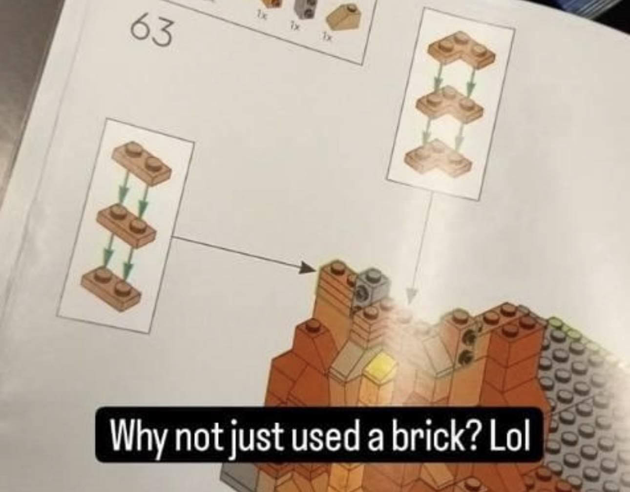 Główne zalety zestawu to jego imponująca i masywna konstrukcja oraz detaliczne odwzorowanie Czarnej Wieży. Budowa jest czasochłonna i wymagająca, co na pewno przypadnie do gustu doświadczonym konstruktorom LEGO. Minusem jest jednak nieco ubogie wnętrze wieży, zwłaszcza na dolnej kondygnacji. Chociaż LEGO musiało samodzielnie wymyślić, jak może wyglądać wnętrze Barad-Dûr, niektóre wybory, takie jak jadalnia dla orków, mogą wydawać się nieco niespójne z mrocznym charakterem tego miejsca. Podczas składania zauważyłem również, że wiele drobnych elementów mogło zostać zastąpione większymi. Poniżej przykład wrzucony na gropę FB fanów LEGO, który udowadnia, że zamiast 3 małych klocków można było zastosować większy element: