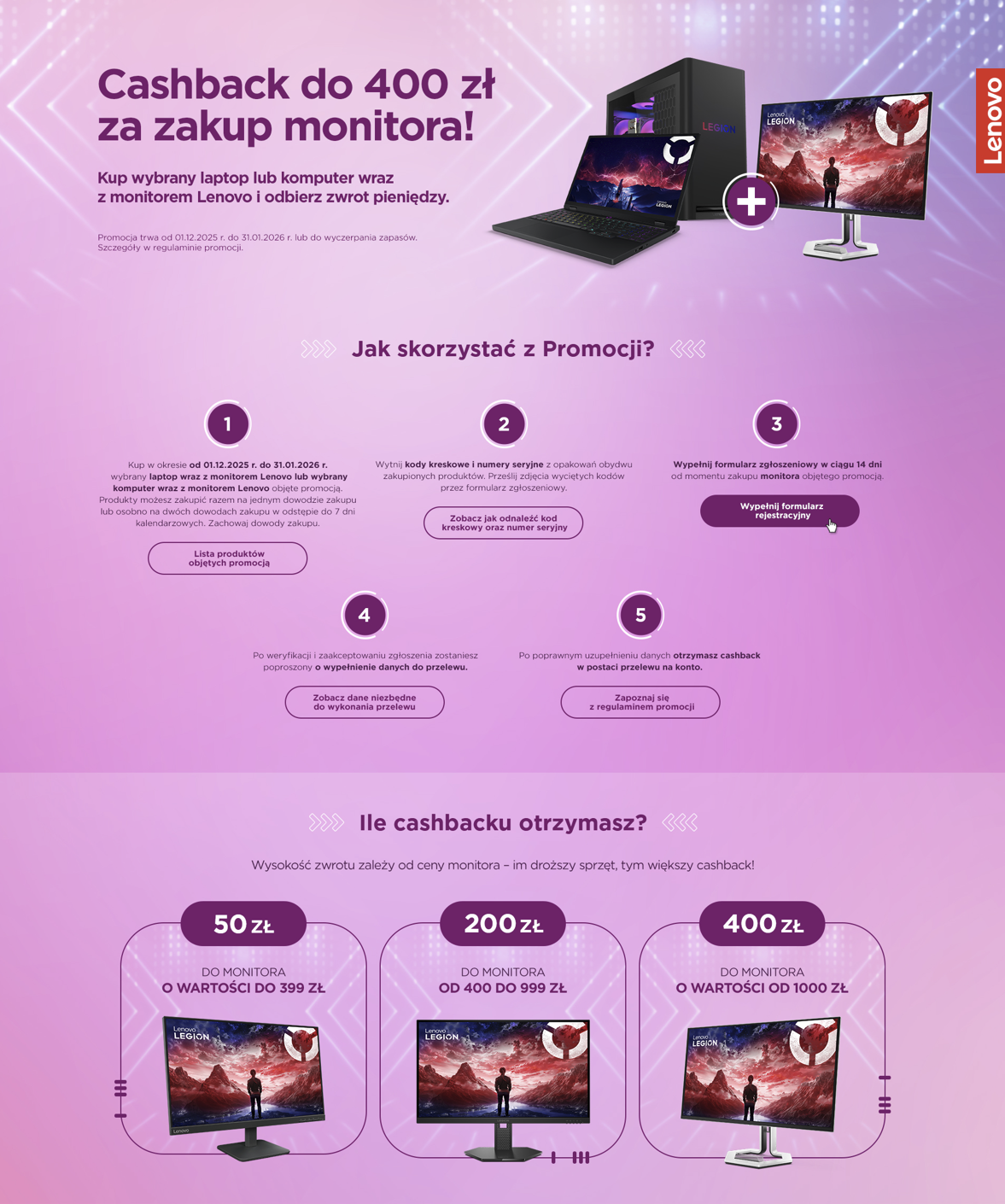 W ramach akcji cashback, trwającej pomiędzy 1 grudnia 2025 roku a 31 stycznia 2026 roku, możemy uzyskać do 400 złotych po zakupie wybranego laptopa bądź komputera stacjonarnego z monitorem Lenovo. Z opakowań obydwu produktów wycinamy kody kreskowe oraz numery seryjne i przesyłamy ich zdjęcia poprzez formularz zgłoszeniowy. Gdy już zgłoszenie zostanie poddane weryfikacji i zaakceptowane, podajemy odpowiednie dane i otrzymujemy cashback jako przelew na konto. Monitor o wartości 399 zł oznacza 50 zł zwrotu, przy wartości pomiędzy 400 a 999 zł otrzymamy 200 zł, wreszcie 400 zł w przypadku monitora o wartości minimum 1000 zł.