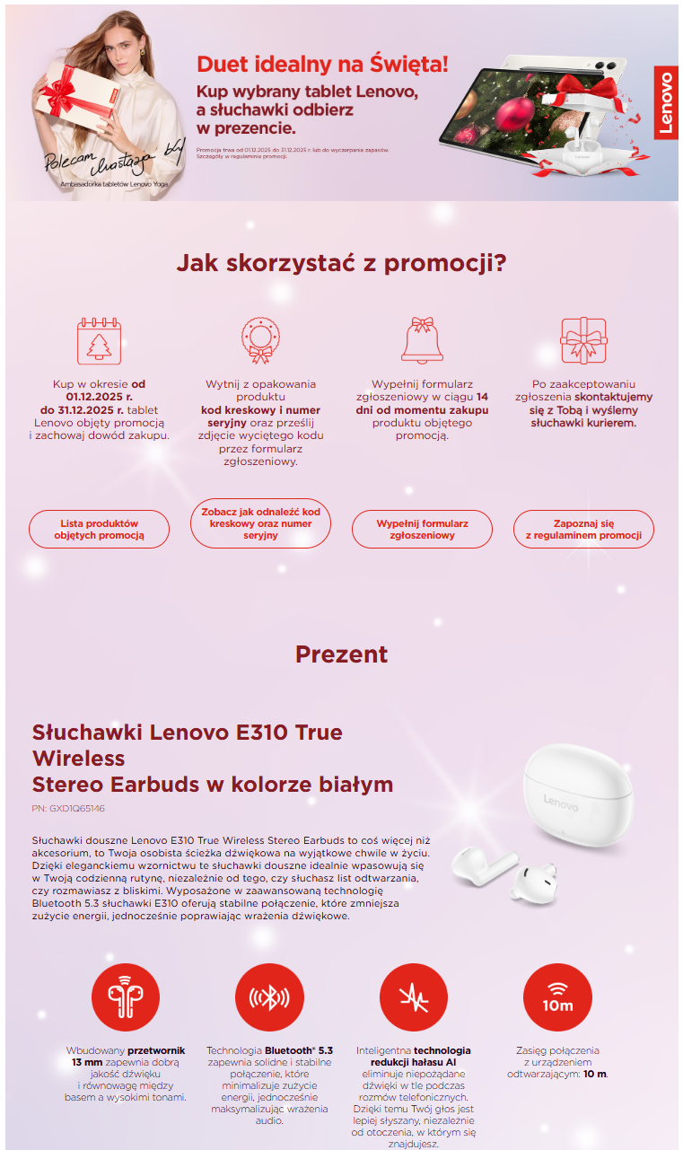 Przede wszystkim pomiędzy 1 a 31 grudnia przy zakupie jednego z objętych promocją tabletów możecie otrzymać wyjątkowy prezent – słuchawki Lenovo E310 True Wireless Stereo Earbuds w kolorze białym.