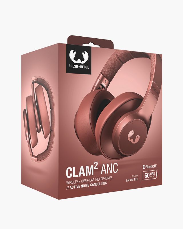 Słuchawki Fresh 'n Rebel Clam 2 ANC oferują imponujący czas odtwarzania muzyki do 60 godzin (lub 45 godzin z aktywną redukcją szumów – funkcją ANC). Funkcja szybkiego ładowania – wystarczy 15 minut, aby słuchawki odtwarzały muzykę do 6 godzin słuchania lub 4,5 z ANC. Pełne ładowanie wynosi 3 godziny. Kształt pałąka i niski nacisk na głowę sprawiają, że słuchawki bardzo wygodnie leżą. Miękkie eko skóry i izolująca konstrukcja doskonale odcinają jedne słuchawki od otoczenia. Dostępne w 8 kolorach: Dreamy Lilac, Silky Sand, Storm Grey, Dried Green, Safari Red, Brave Bronze, Deep Mauve oraz Dive Blue. Do zestawu dołączone są etui na słuchawki, kabel ładujący USB-C i kabel audio 3,5 mm.