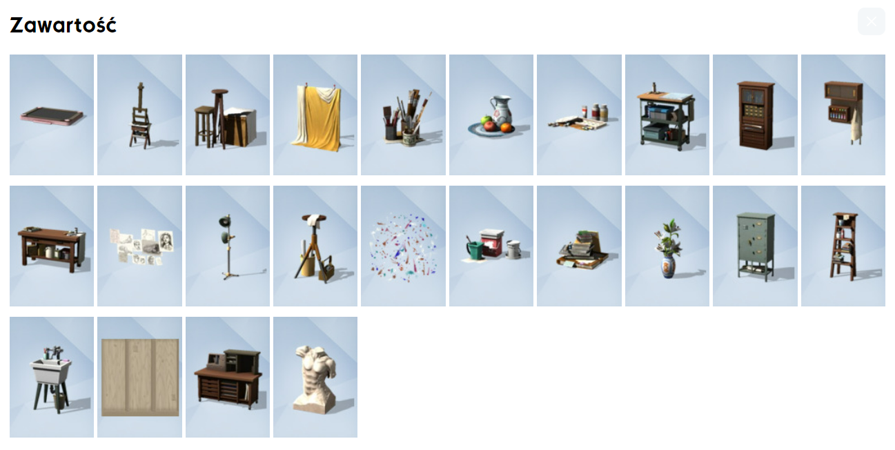 Tutaj zawartość dodatkowa została skierowana do artystycznych dusz. Otrzymamy bowiem kolejny wariant sztalugi, tableta graficznego oraz stołu do majsterkowania. Oprócz przedmiotów użytkowych mamy również obiekty dekoracyjne, które można w dowolny, kreatywny sposób wykorzystać przy malowaniu obrazów. Stworzą również świetne i klimatyczne otoczenie w pomieszczeniu pełniącym funkcję pracowni naszego sima.