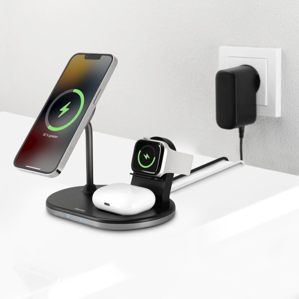Wszystkim wielbicielom najnowszych produktów z charakterystycznym logo nadgryzionego jabłka możemy z czystym sercem polecić wygodne akcesorium – ładowarkę indukcyjną Hama 3w1 MagCharge Multi. Będzie stanowić dla nich prawdziwe wybawienie przy gąszczu dodatkowych kabli i urządzeń. Dzięki niej bez problemubezprzewodowozasilimy energią najnowsze iPhone’y  12 i 13 , słuchawki AirPods i smartwatche Apple Watch. Sprzęt współpracuje ze wszystkimi produktami z serii Apple MagSafe i Hama MagLine. Ten zintegrowany pierścień magnetyczny o maksymalnej mocy wyjściowej 15 W, umieszczony na kulowym przegubie, umożliwia łatwe zadokowanie urządzenia w ładowarce i ustawienie go w optymalnej pozycji do skutecznego ładowania. Bez potrzeby ręcznej konfiguracji. Tak zyskujemy trzy funkcje w jednej, niewielkiej zmyślnej konstrukcji.