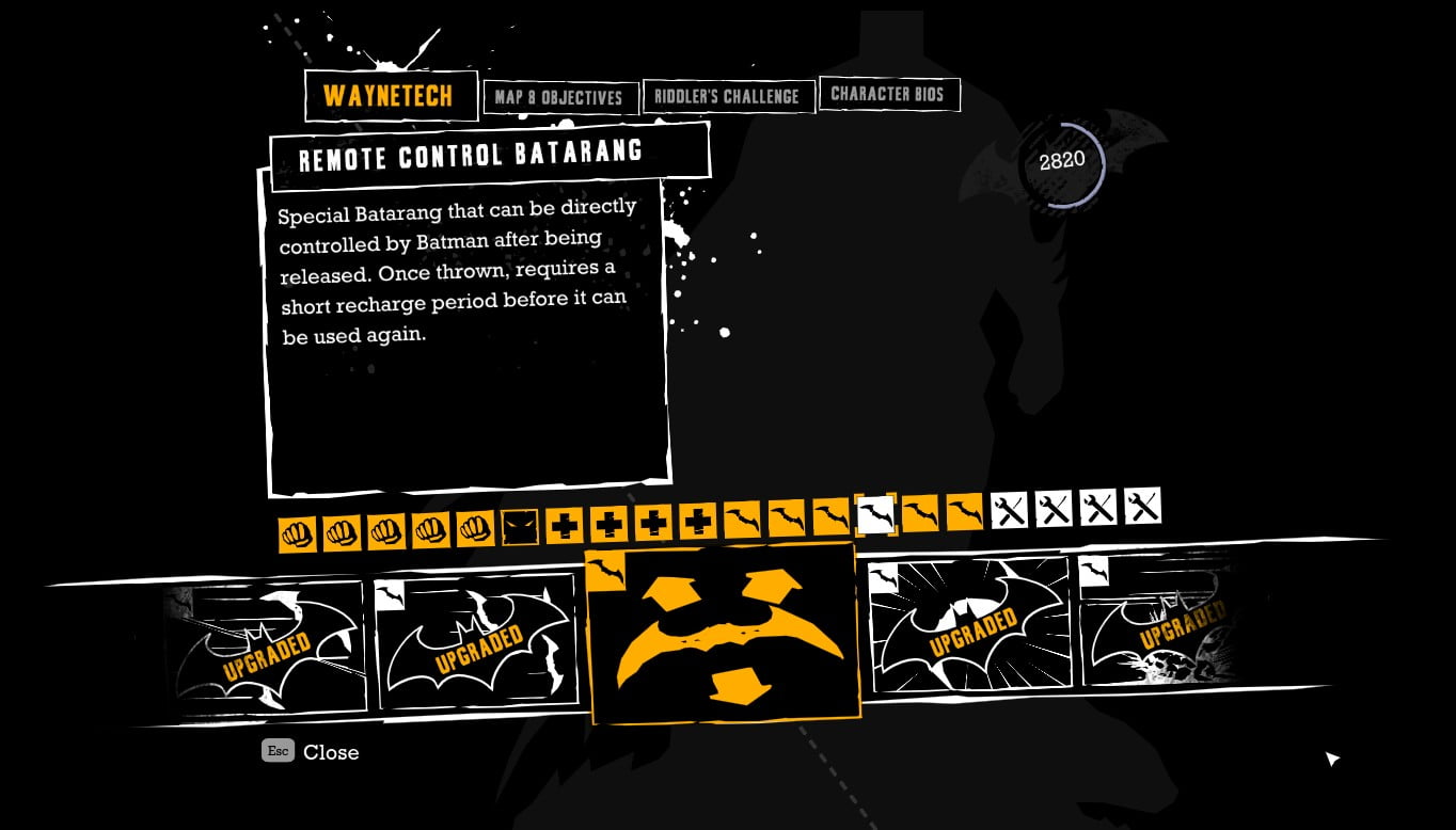 W grze mamy do czynienia z różnymi gadżetami Batmana. Na początku mamy ich jeden rodzaj – batarang, natomiast podczas zagłębiania się coraz bardziej w fabułę otrzymujemy kolejne (wybuchowy żel, batclaw, etc.). Za ich pomocą możemy pokonywać kolejne przeszkody, a także wrogów. Grę wyposażono również w możliwość zbierania punktów doświadczenia, które wykorzystujemy na kolejne czy to umiejętności czy wzmocnienia pancerza, zaliczające się do kategorii Waynetech (technologie firmy Wayne’a).