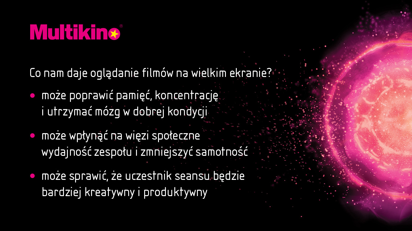 Doświadczenia kulturowe, takie jak chodzenie do kina, dają naszemu mózgowi możliwość poświęcenia niepodzielnej uwagi przez dłuższy czas. W szczególności w kinie nie mamy nic innego do zrobienia poza zatraceniem się w filmowej historii. – wyjaśnia Dr Joseph Devlin, profesor neurologii poznawczej na UCL – Ponadto nasza zdolność do utrzymywania skupienia i uwagi odgrywa kluczową rolę w budowaniu naszej odporności psychicznej, ponieważ rozwiązywanie problemów zazwyczaj wymaga skoncentrowanego wysiłku, aby pokonać przeszkody.