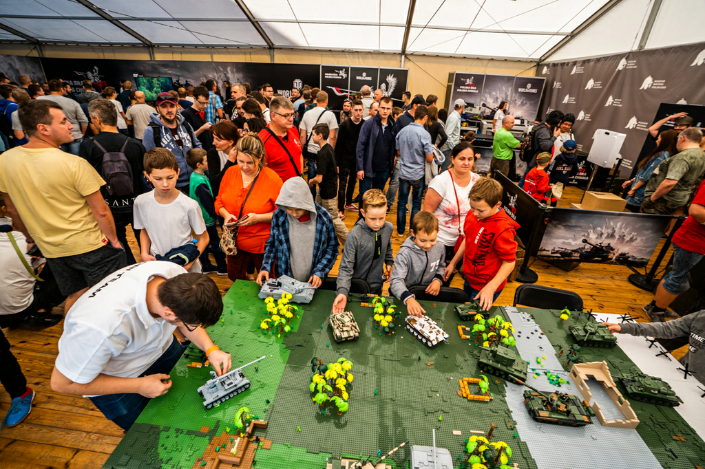 Impreza dla wszystkich również była znakomicie przygotowana. Na pierwszym planie było oczywiście to, co mogliśmy zobaczyć na specjalnie przygotowanej scenie. Co prawda zabrakło tam O.S.T.R.-a – którego wokalny udział w promowaniu tego przedsięwzięcia był wielką petardą – i można było jedynie obejrzeć teledysk z nim na wielkim telebimie, jednak w dalszym ciągu było na co popatrzeć. Przede wszystkim w późniejszych godzinach eventu koncert dał zespół Żywiołak – jego członkowie tworzyli szatę dźwiękową do gry Wiedźmin 2 oraz Wiedźmin 3 – świetnie wkomponowując się w nastrój wydarzenia. Rzecz jasna, publiczność miała również możliwość zagrania w World of Tanks na specjalnie przygotowanych do tego stanowiskach, a tam aż roiło się od przedstawicieli wszystkich możliwych grup wiekowych. Do tego m.in. liczne konkursy z nagrodami i coś dla najmłodszych – stoisko przeznaczone do zabawy klockami firmy Cobi. Z bólem serca musieliśmy jednak zrezygnować z zabawy klockami, aby zrealizować wywiady… Ale szybko okazało się, że to jeszcze lepsza forma rozrywki, a to za sprawą interesujących rozmów, które przeprowadziliśmy z Andrey’em Biletskim – dyrektorem kreatywnym World of Tanks, Konradem Rawińskim – senior PR managerem na Polskę i Kraje Bałtyckie, Piotrem Hałaczkiewiczem – regionalnym producentem wydawniczym polskiej linii do gry, a także z członkami zespołu Żywiołak.