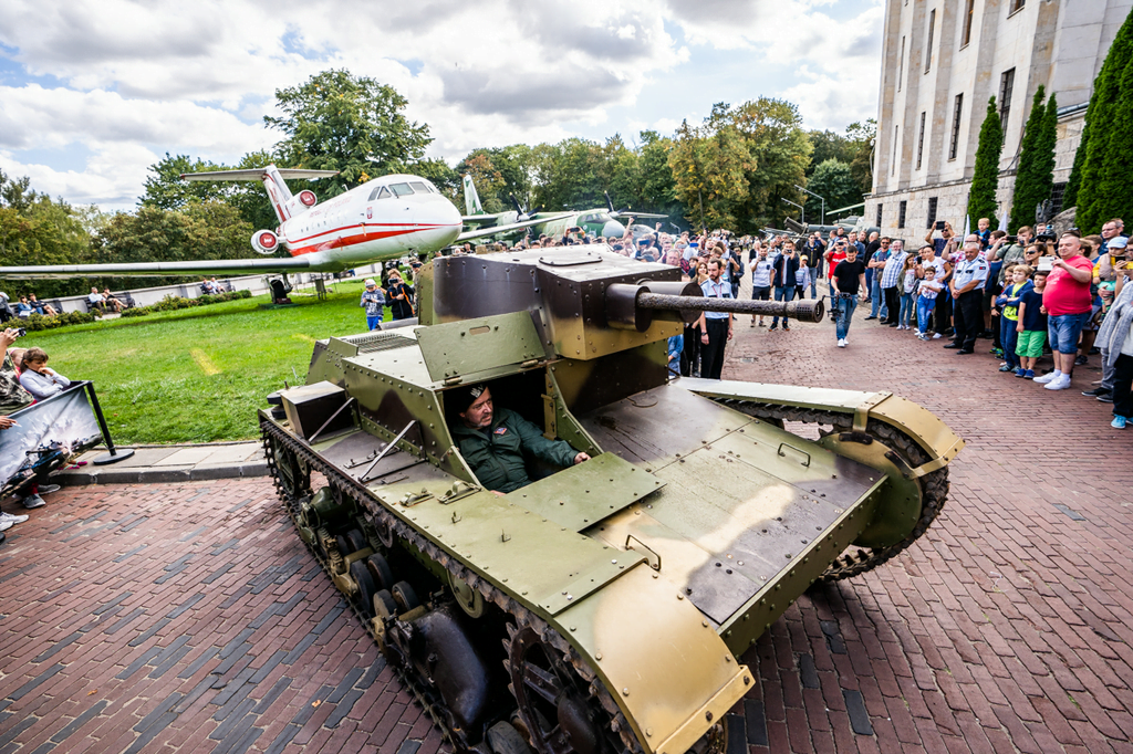 Dlaczego powyżej został przybliżony plan zaledwie do godziny 15-tej? Powodem tego jest ekskluzywna część medialna eventu. Rozpoczęła się ona o 11-tej w Muzeum Polskiej Techniki Wojskowej. O ile sam program sceniczny i ilość atrakcji przy warszawskich Alejach Jerozolimskich potrafiły zrobić niemałe wrażenie i przyśpieszyć bycie serca, o tyle program dotyczący muzeum na Powsińskiej 13 spowodował zbieranie żuchwy z ziemi! Rozpoczął go wykład dyrektora Mirosława Zientarzewskiego – niezwykle absorbująca prelekcja w której wiedza z dziedziny mechaniki pojazdów pancernych oraz historii przeplatała się raz po raz, roztaczając czar przed słuchaczami. Ale wykład miał też część praktyczną, bo czymże jest nauka bez praktyki! W trakcie wykładu, pan dyrektor oprowadzał nas po kolejnych pomieszczeniach. Mogliśmy wejść do tankietki, podziwiać mundury oraz broń, pojazdy pancerne, a nawet działa i… samochody.