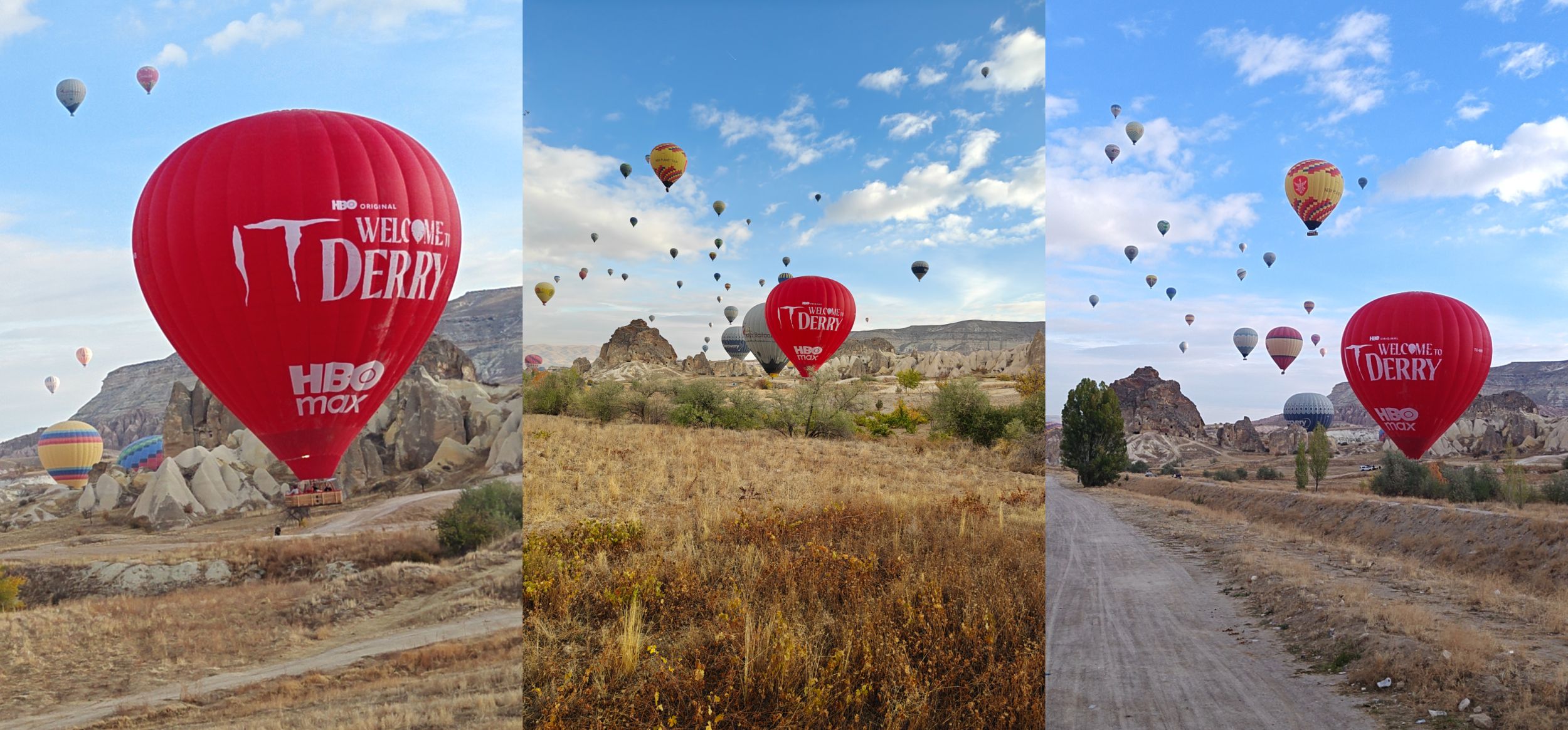 Georgy it is time to fly.Ta o to fraza krążyła w moich myślach, kiedy odbiliśmy się od ziemi. Był to wyjątkowo gładki start, aż mnie to zaskoczyło. Trzydziestoosobowy balon zabrał całą ekipę HBO, obecną w Kapadocji, w górę. Poszybowaliśmy, aby zobaczyć malownicze tereny, ale jednak nie one były najważniejsze. Bowiem to balon obok naszego był, znacznie bardziej wyjątkowy i to na nim skupiła się nasza uwaga. Stworzona specjalnie na to wydarzenie czasza sąsiedniego balonu, była cała czerwona i wzbogacona dwoma hasłami: TO: Witamy w Derry, a także dwuznacznym sloganem produkcji To zaczęło się tutaj. Balon ten był naprawdę piękny, ale oczywiście nie musicie mi wierzyć na słowo, jego zdjęcia zobaczycie poniżej.