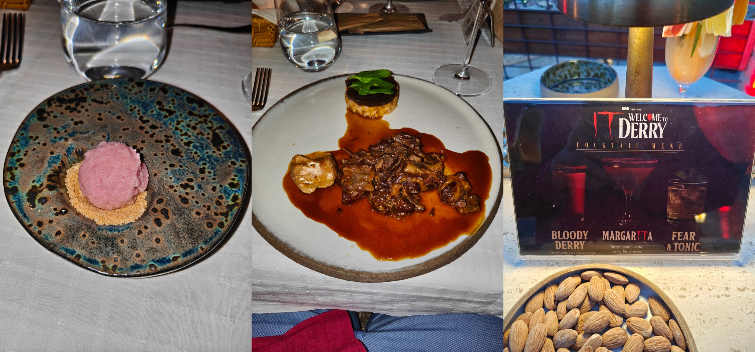 Ważnym elementem pierwszego dnia, była uroczysta kolacja. Rozpoczęta została ona poprzez mrożące krew w żyłach koktajle, specjalnie skomponowane na tę okazję. Na ściance zdjęciowej, oprócz już tradycyjnego balonika towarzyszył, nam także nie kto inny, jak sam Pennywise. Przepiękne krajobrazy nie opuściły nas nawet wtedy. Następnie, gospodarze zaprosili nas piętro niżej do przytulnej, wypełnionej czerwienią i nawiązaniami do Derry restauracji, gdzie mieliśmy przyjemność uczestniczyć w prezentacji lokalnej kuchni.