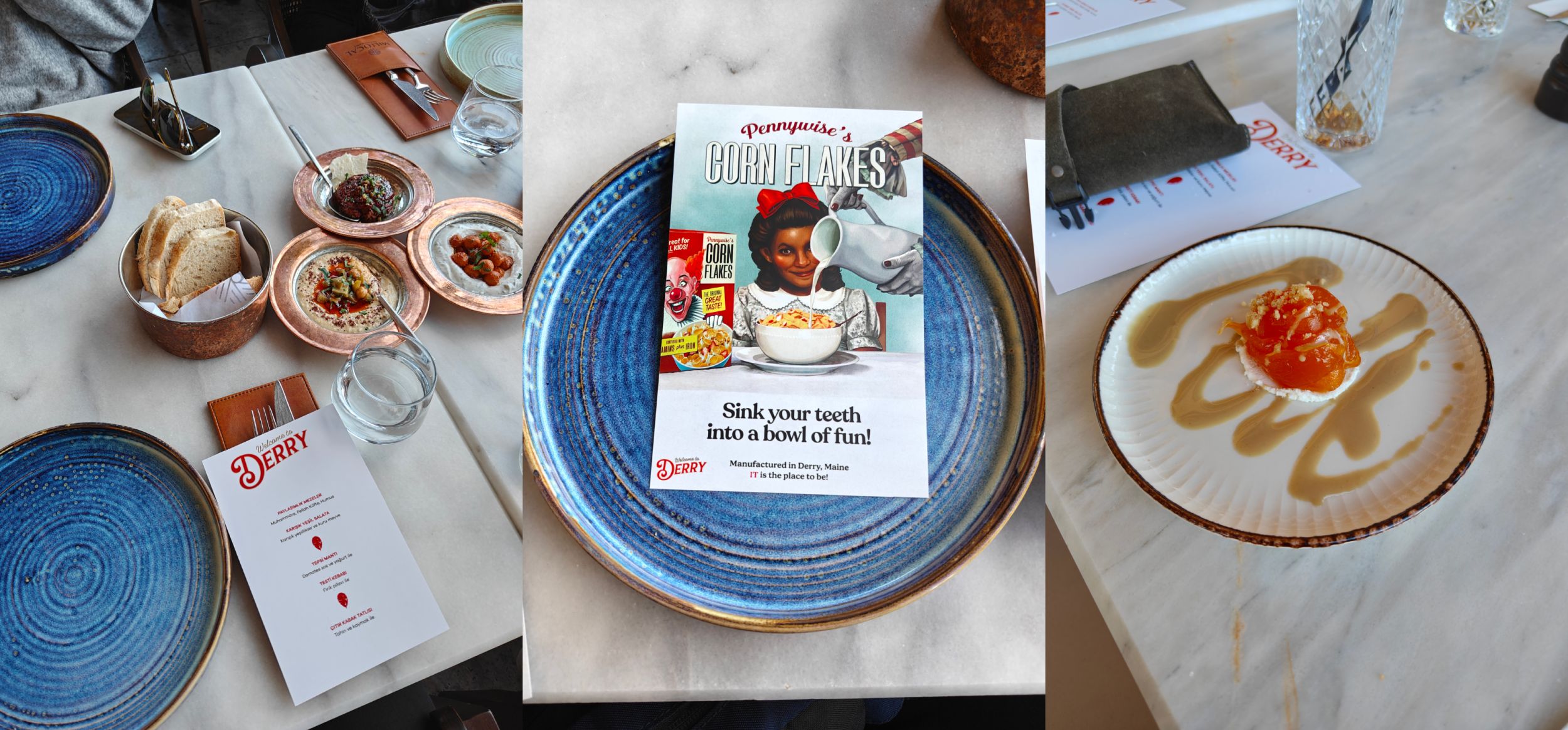 Wracając, pierwszy dzień rozpoczął się od wycieczki do miejsca, w którym chrześcijańscy mnisi trzymali gołębie. Następnie przemieściliśmy się, wraz z naszymi czerwonymi balonikami do miejsca, które górowało nad okolicą. Była to lokalna, twierdza, wieki temu odpowiadająca, za ochronę tych ziem. Kolejnym etapem podróży był lunch, na którym oprócz lokalnej kuchni, mieliśmy możliwość poznać także trochę języka tureckiego. Dwustronne tematyczne menu, zawierało nazwy dań, a także plakaty promocyjne serialu. Pytacie jakiego? Oczywiście, że To: Witajcie w Derry.