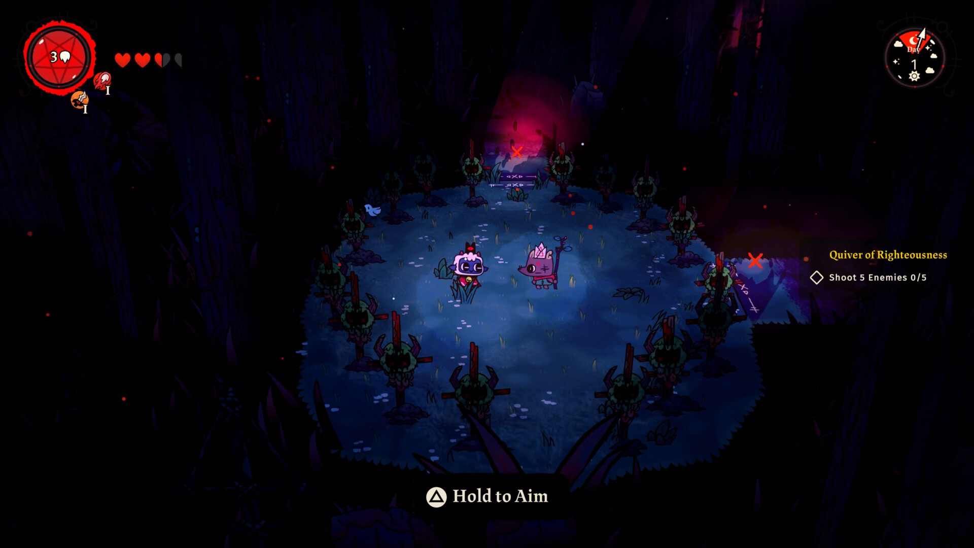 Gra została podzielona na dwa oddzielne elementy gameplayowe. Pierwszy to budowanie naszej wioski kultu, a drugi to walka z sektą, która złożyła nas w ofierze. Każdy z elementów świetnie uzupełnia ten drugi. Bo gdy już mamy dość wyżynania wrogów i eksplorowaniem kolejnych lochów, wracamy do domu, by chwilę później liczni wyznawcy zarzucili bohatera swoimi pretensjami i zachciankami. Trudne jest bowiem życie lidera barankowego kultu. Jeśli chodzi o samo walkę, to jest ona naprawdę ciekawa, a jednocześnie dobrze graczom znana. Cult of the Lamb to bowiem roguelite, gdzie przez większość czasu będziemy zwiedzać generowane losowo poziomy. Wraz ze wzrostem liczebności najesz sekty, możemy odblokowywać kolejne lokacje. Jest ich łącznie 4, a każda prezentuje inny biom. Lokacje odwiedzamy wielokrotnie, ale za każdym razem możemy spodziewać się czegoś innego. Na początku dostajemy na przykład losową broń oraz moc (tę ładujemy, zbierając upuszczoną przez przeciwników energię).
