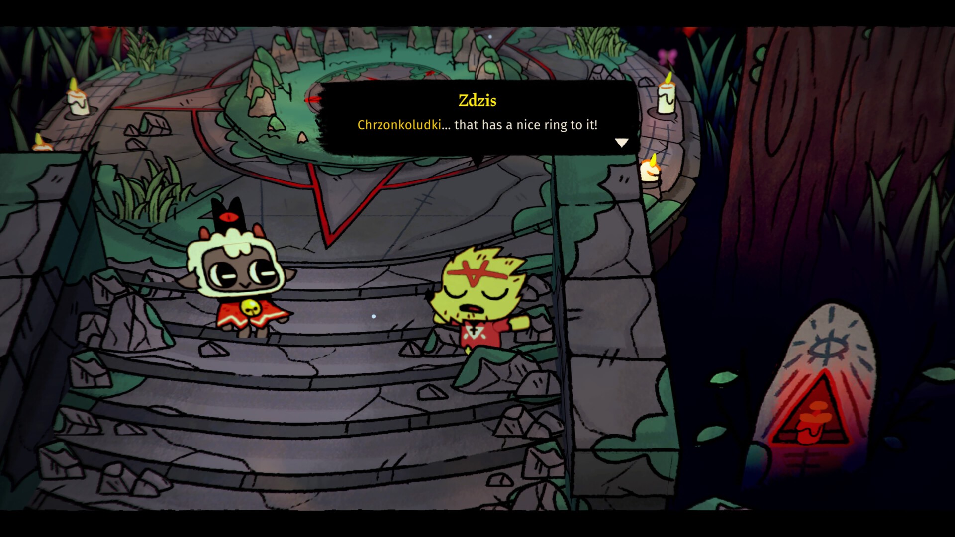 Kierowanie trzódką w Cult of the Lamb opiera się mocno na właśnie takim mikrozarządzaniu. Nie możemy bowiem pozwolić na załamanie się naszej relacji z wyznawcami. A ci nie ułatwiają nam życia. Co rusz dostajemy od nich prośby, a ich z ignorowanie może się bardzo nie spodobać. Czasem jest łatwo – „zbuduj 3 ozdoby”. Innym razem bywa ciężko – „zabij w nocy Waldka, bo go nie lubię”. Zapomniałbym – w grze podczas przyjmowania nowego kultysty, możemy nadać mu dowolne imię oraz jeden z odblokowanych awatarów. U mnie nazywanie ich dość osobliwymi imionami jeszcze mocniej podnosiło poziom absurdu tego tytułu. Dlatego też to Basia zleciła mi zabójstwo Waldka. Wracając, do wyboru mam dokonanie mordu – co przy nieudanej próbie zatuszowania sprawy może innych trochę wkurzyć – albo niepodjęcia tematu, co niestety mocno wpłynie na niezadowolenie Basi i wyraźny spadek wiary całego kultu. Co jest mniejszym złem? – zapytałby pewnie Geralt.
