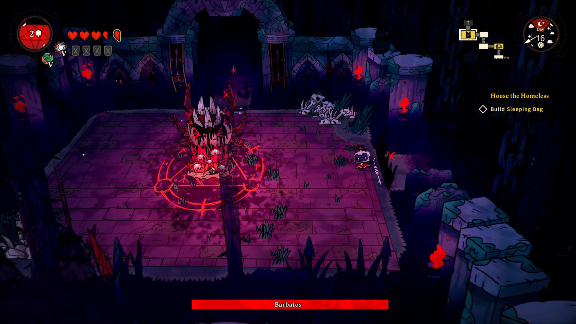 Nasza wioska to także miejsce, którym musimy z głową zarządzać. Gdy kult rośnie w siłę, mamy więcej potrzeb do spełnienia, ale też otrzymujemy przydatne narzędzia, aby temu zadaniu sprostać. Brakuje drewna do budowy łóżek. Możemy zbudować miejsce jego zdobywania, bo drzewa wolno rosną i szybko się kończą. Brakuje jedzenia? Budujemy farmę, gdzie sadzimy owoce. Jej obchodzenie możemy zlecić wyznawcom, co odciąży z obowiązku nas. Shit problem? Stawiamy budkę ze sprzętem do sprzątania, by kto inny ogarniał za nas ten śmierdzący problem. Jego zaniedbanie może bowiem doprowadzić do zarazy w sekcie. Przez cały czas podczas przemierzania lochów zbieramy też surowce. Te z czasem trzeba przetwarzać, by użyć ich do bardziej złożonych budowli. W tym celu przyda się sakralna rafineria. Nie można zapominać też o szkodnikach – strach na wróble świetnie sprawdzi się na wyjadające jagody ptaki. Roboty zawsze mamy w grze po uszy, a odpowiednie planowanie jest tu kluczowe. Wszystko to jednak przekłada się na rozgrywkę piekielnie uzależniającą.