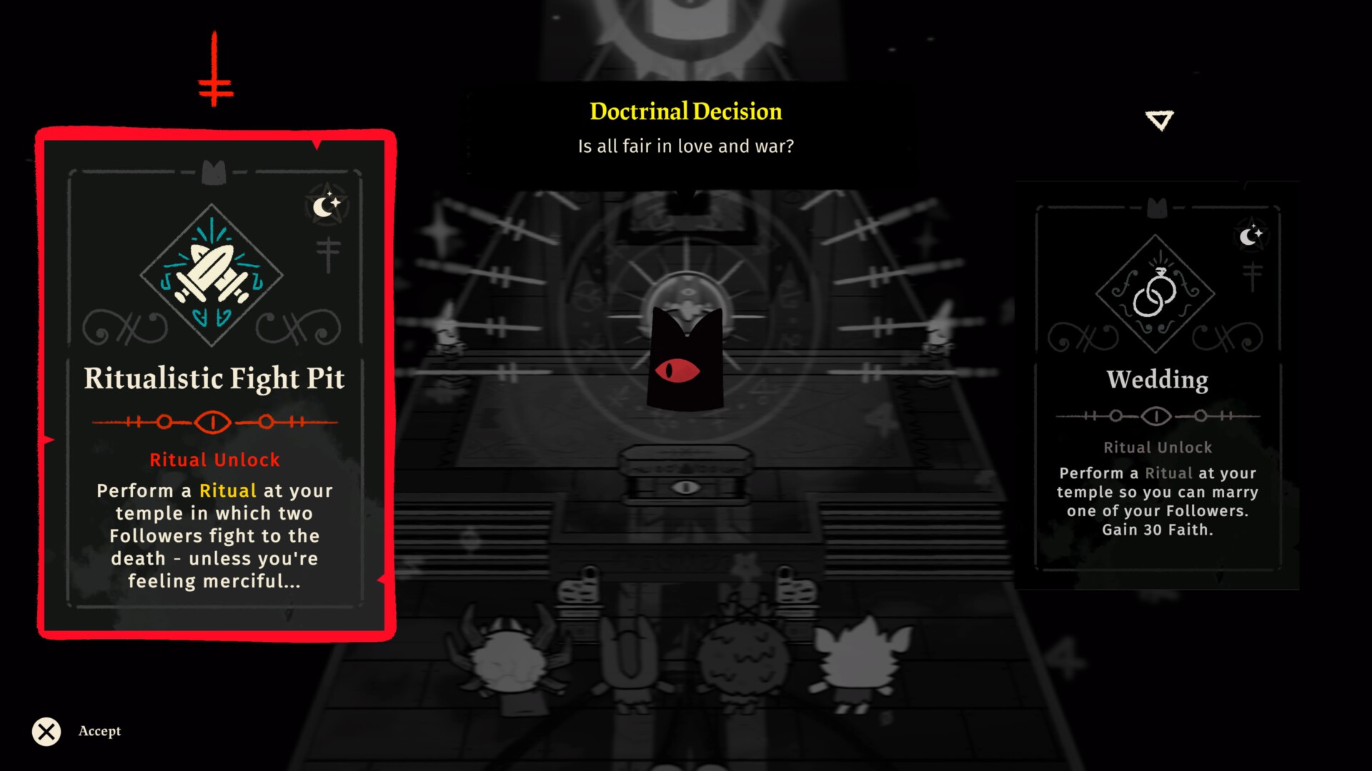 W grze bardzo szybko może zrobić się nieciekawie. Jeśli będziemy dopuszczać do śmierci z głodu, reszta będzie tracić w nas wiarę. Nie będą chcieli pracować, więc rozwój wioski zostanie zahamowany. Szybko pojawią się buntownicy, którzy będą namawiać do przeprowadzenia rewolucji. Z czasem zaczną odchodzić z sekty, przy okazji zabierając cześć naszych pieniędzy. Aby opanować sytuację, możemy na przykład zabić podjudzacza. Tylko czy zrobić to na widoku, aby nastraszyć resztę, czy może po cichu, by jeszcze bardziej im nie podpaść? A może jednak zrezygnować z tej metody i dać tracącemu wiarę drugą szansę? Da się przecież jeszcze zbudować więzienie, gdzie nasze słowa będą miały większą moc i być może uda się nawrócić go na właściwą drogę. A co jeśli nawet opanowanie sytuacji nie przywraca wiary poddanych do zadowalającego stanu? W mrocznym kościele możemy jeszcze odprawić czarną mszę, określić nową doktrynę, a także przeprowadzić rytuał. Mięsna uczta, ludzka ofiara bogom, pojedynek na śmierć i życie czy też wskrzeszenie zmarłego. Nic tak nie odbudowuje morale jak krwawa jatka na ołtarzu.