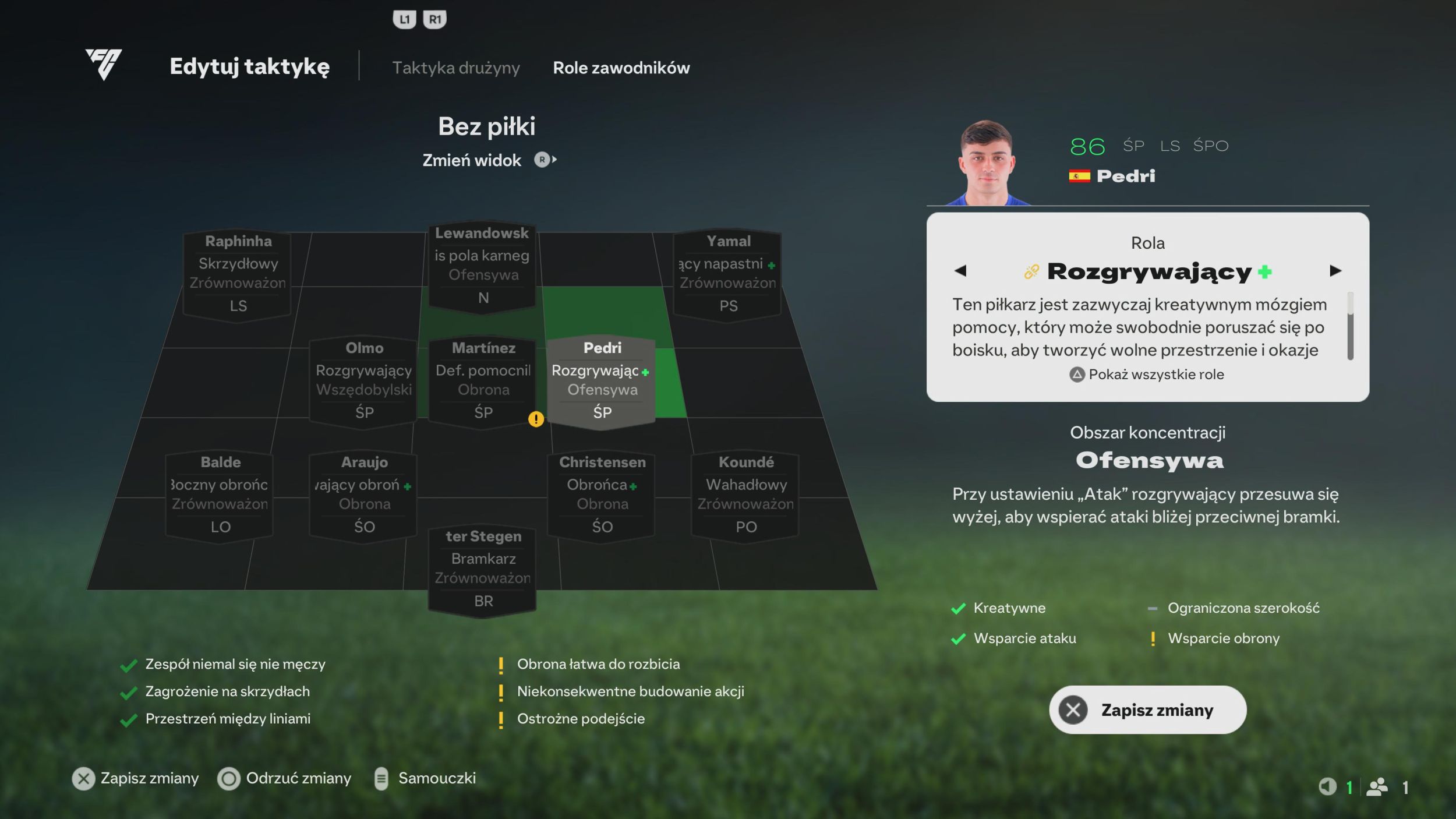 FC IQ pozwala nam bowiem przyjrzeć się z bliska każdemu zawodnikowi z osobna i dostosować jego zachowanie do naszej gry czy też wykorzystać lepiej jego mocne strony. Od teraz możemy zdecydować czy na przykład Pedri będzie częściej kręcił się w okolicy pola karnego, czy jednak stanie się płucami drużyny i będzie sobie wypluwał flaki jako zawodnik box to box (biegający od jednego pola karnego do drugiego). A wchodząc jeszcze głębiej w szczegóły – na początku klasycznie decydujemy czy nasz piłkarz ma przybrać pozycję napastnika, pomocnika czy skrzydłowego, a potem jeszcze wybieramy jego rolę – dla środkowego pomocnika może to być półskrzydłowy, defensywny pomocnik, cofnięty rozgrywający, box to box, rozgrywający. Dla każdej roli przypisane są konkretne zadania, które zawodnik powinien sukcesywnie wykonywać. Łącznie Elektronicy przygotowali aż 31 ról, z czego każda posiada od jednego od trzech celów.
