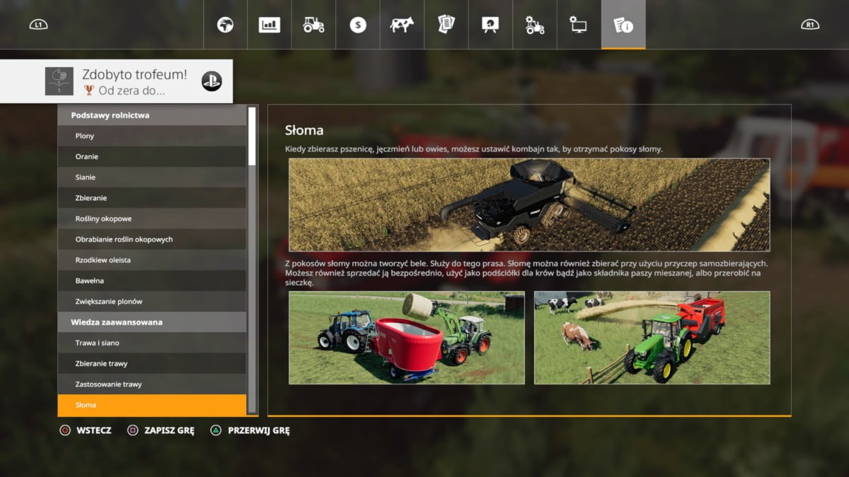 Tak prezentują się nowości w najświeższej odsłonie serii, a teraz przejdźmy do tego, co tak naprawdę możemy tutaj robić. Jako że jestem świeżakiem w cyfrowym farmingu, a moja skromna wiedza o uprawie roli pochodzi z obserwacji poczynań rolników w rodzimej wsi, to musiałem uczyć się wszystkiego praktycznie od zera. Takim jak ja z pomocą przychodzą przygotowane przez twórców samouczki, które uczą zasad wykonywania prac na naszych polach. Dowiemy się tutaj, jakich sprzętów użyć do zbioru pszenicy, nawożenia upraw czy jak belować słomę i siano. Gra nauczy nas także jak ścinać oraz przygotowywać do transportu drzewa. Samouczków jest naprawdę sporo i dają nam dużo przydatnych informacji przed rozpoczęciem kariery.