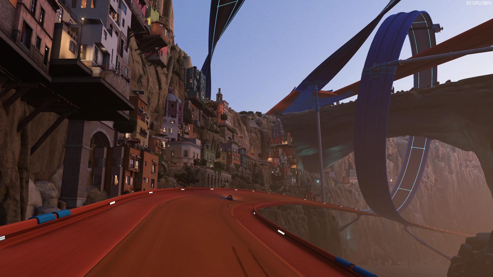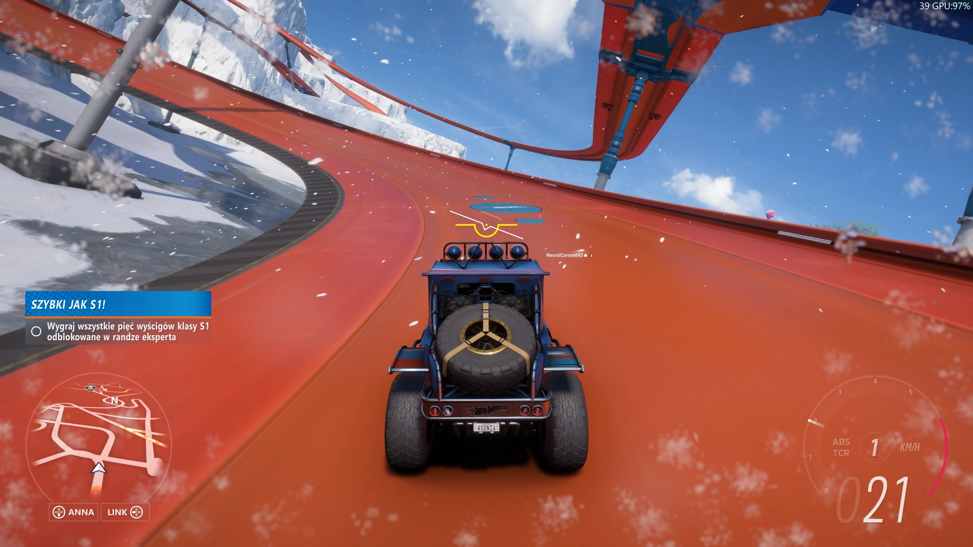 Druga rzecz to zróżnicowanie poziomu trudności oraz uatrakcyjnienie modelu jazdy. Z nowości trzeba będzie wyróżnić obecność „poziomicy” (fachowo nazywa się to roll indicator, czyli po polsku wskaźnik przechyłu), która widzimy na samym środku ekranu. Ta pokazuje nam jak nasze auto obraca się w czasie jazdy i dodatkowo jest punktem, na którym możemy skupić nasz wzrok. Myślę, że pomóc to może osobom, które dopiero przyzwyczajają się do szybkiej jazdy, a wirowanie w parku Hot Wheels potrafi przyprawić o zawrót głowy.