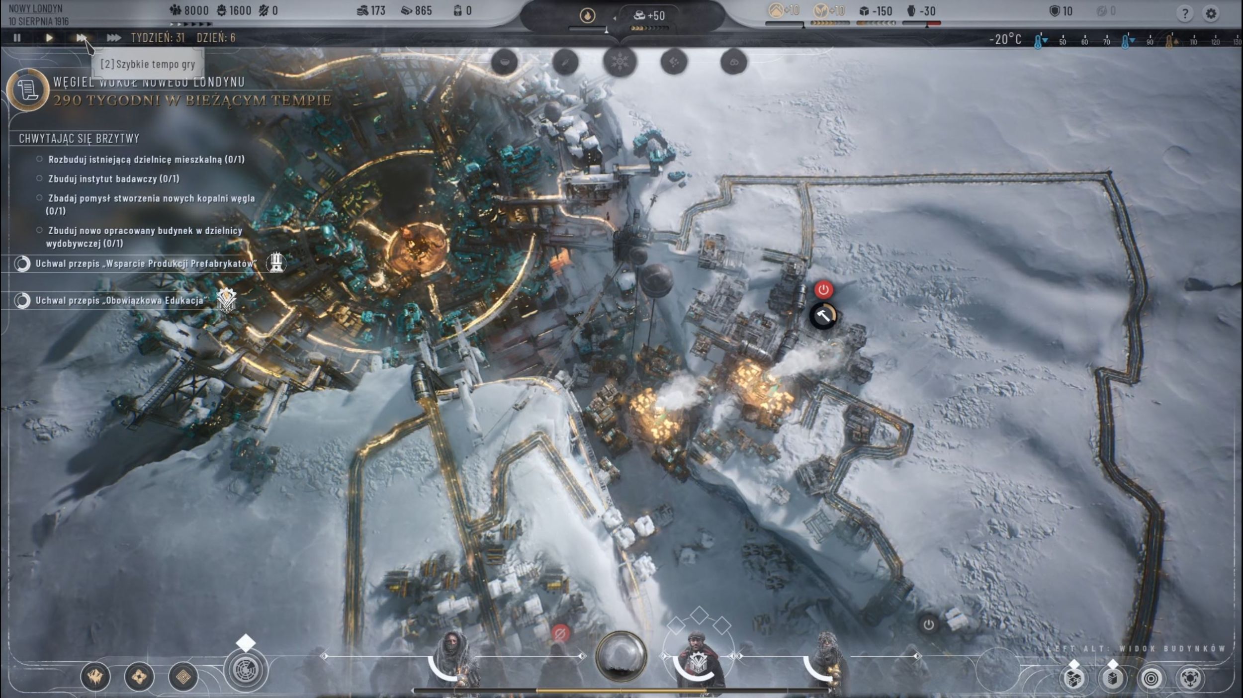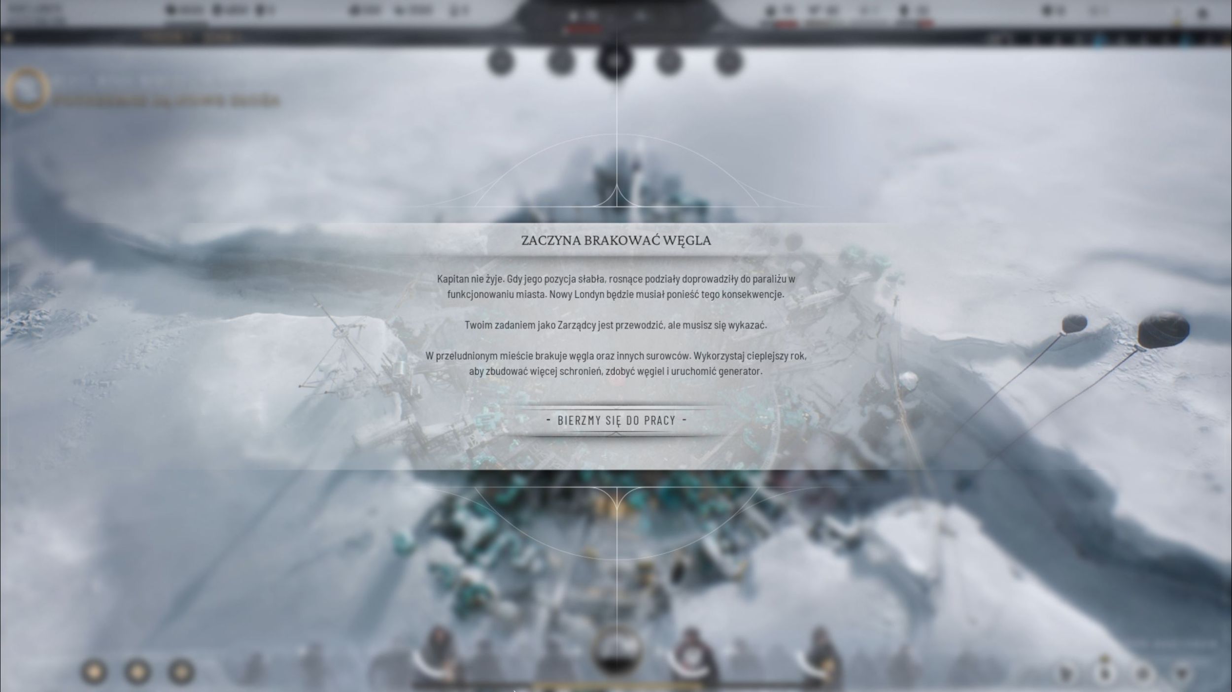 Myślę że w tym momencie dobrze byłoby powiedzieć też coś o oprawie audiowizualnej tytułu. Dźwiękowo jest naprawdę dobrze. Już pierwszy Frostpunk postawił poprzeczkę naprawdę wysoko i mogę śmiało stwierdzić, że dwójeczka mu pod tym względem dorównuje. Graficznie jest dużo lepiej niż w oryginale, ale może to być zasługa tego, że teraz nie musimy już widzieć pojedynczych ludzi czy maszyn, a widzimy całe dzielnice. Uznajmy zatem, że skoro aspekt audiowizualny nie spadł, a nawet urósł w siłę, to jest dobrze. Bardzo muszę za to pochwalić nowy wygląd HUDa. Wszystko jest tutaj bardzo przejrzyste, a monitorowanie nastroju w społeczności i ilości materiałów jest dzięki temu niezwykle łatwe. Trudnością oczywiście jest za to wpływanie na te wskaźniki. To zdecydowana poprawa względem pierwowzoru, który w tym aspekcie aż tak przyjazny nie był.