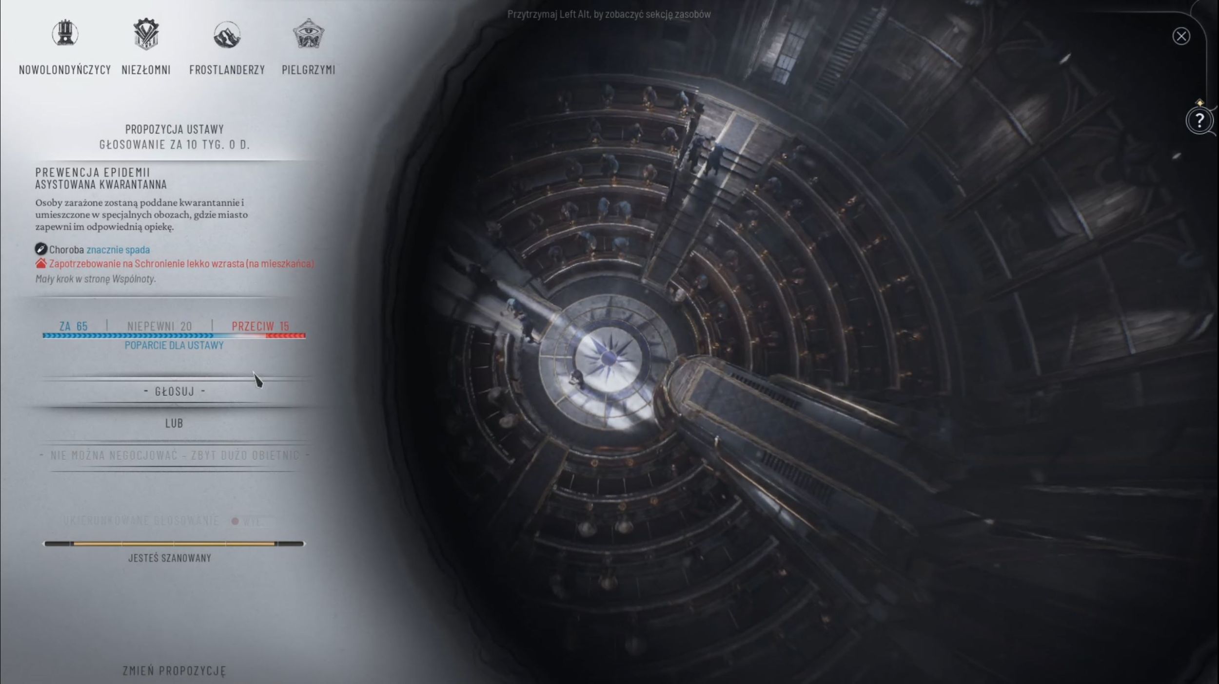 Podczas rozbudowy miasta musimy zwracać uwagę nie tylko na to, ile mamy materiałów czy jednostek do pracy. Istotną rzeczą jest także ilości jednostek ciepła, którą generuje nasz piec, ilość domów zbudowanych dla mieszkańców oraz ich nastroje. Aby cała społeczność działała jak Szwajcarski zegarek musimy rozwijać technologię i ustanawiać nowe prawa. Niektóre z nich zyskają na poparcie lewicy, a niektóre prawicy. O ile nadal sami możemy decydować, o tym, w którą stronę będziemy się rozwijać technologicznie, to możemy podjąć decyzję, która ze stron będzie czuwać nad badaniami. Często bowiem będzie to decydowało o dodatkowych korzyściach i stratach, które uzyskamy po przeprowadzeniu konkretnych badań. Zdarza się jednak też tak, że przy niektórych projektach obie strony myślą podobnie. Inaczej jest za to przy ustalaniu praw. Tutaj możemy co prawda zdecydować, które prawo chcemy wprowadzić w życie, ale czy tak się faktycznie stanie decyduje głosowanie. W radzie zasiadają wszystkie grupy społeczne oraz wszystkie frakcje, a ilość głosów, które mogą oddać jest przy nich wypisana. Jak już zdecydujemy, które prawo chcemy wprowadzić w życie podchodzimy oczywiście do głosowania. Zanim jednak do tego dojdzie możemy ponegocjować z różnymi partiami społecznymi. W zamian za ich głosy możemy obiecać, że następnym razem wprowadzimy w życie konkretna prawo, zbudujemy jakiś budynek lub opracujemy wybrane przez nich technologie. Ciekawym pomysłem jest możliwość połączenia swojego konta Twitch, aby nasi widzowie mogli również decydować o przyszłości naszego miasta. Już teraz widzisz pewnie, że o ile pierwowzór stawiał raczej na przetrwanie w niekorzystnych warunkach, to tutaj nie martwimy się już tylko o to, czy przeżyjemy, ale też jak przeżyjemy. Oczywiście – w oryginale również podejmowaliśmy decyzje moralne, ale to Frostpunk 2 wchodzi tutaj na wyżyny.