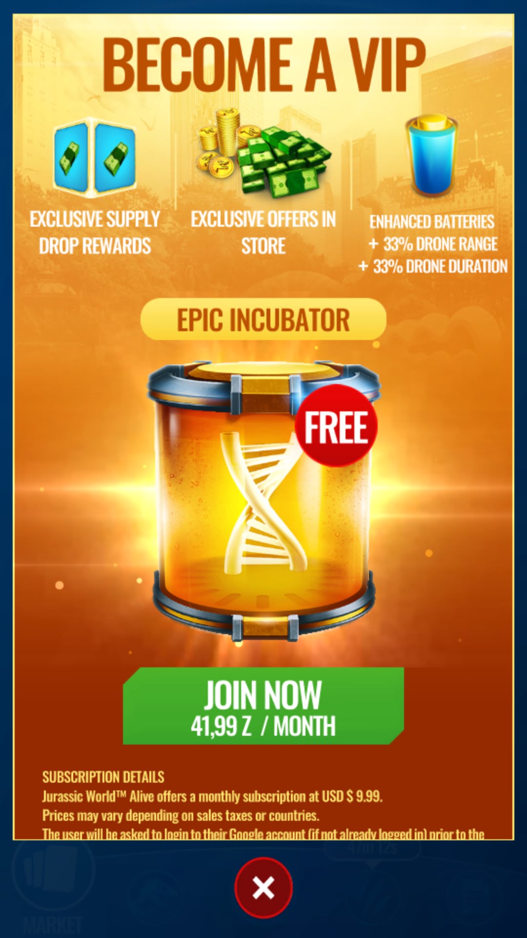 Dodatkowo gracze mają możliwość wykupienia za 41,99 zł statusu VIP na miesiąc, dzięki któremu otrzymają dodatkowy inkubator, większy o 1/3 zasięg drona (zwiększa się możliwość łapania dinozaurów oddalonych od gracza do 200 metrów, ze standardowych 150) oraz wydłuża się o 33% czas jego działania.