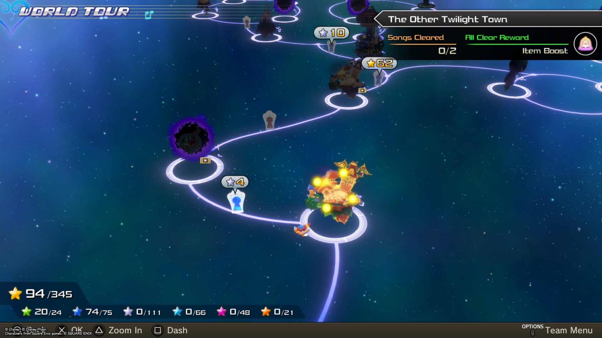 Świat Kingdom Hearts: Melody of Memory został zbudowany na wzór znanych odsłon serii. Przemierzamy więc planety-światy i wykonujemy kolejne misje – tutaj odgrywamy utwory muzyczne. Każdy z nich musimy przynajmniej ukończyć – to jest przeżyć i dotrzeć do mety. Jednak odblokowanie dalszych etapów wymaga również uzbierania przez nas odpowiedniej ilości gwiazdek, a te z kolei kolekcjonujemy za spełnienie specjalnych celów w misjach. Raz jest to ukończenie etapu z przynajmniej z połową życia, innym razem wykonanie perfekcyjnych uderzeń przynajmniej w 60% przypadków, a jeszcze innym ukończenie misji na ekspercie. Jest tego naprawdę dużo – wystarczy wspomnieć, że łącznie możemy zebrać aż 345 gwiazdek przy około 140 utworach. Na szczęście do ukończenia gry i odkrycia wszystkich bonusowych światów wystarczy 280, więc jeśli macie problem z którymś zadaniem, nie musicie się bardzo męczyć – ekspertowe wyzwania potrafią dać w kość.