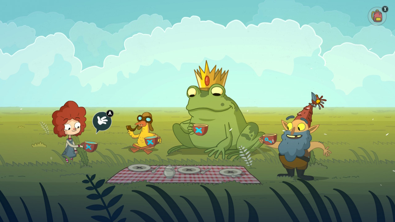 Nie muszę chyba już szczególnie się na tym skupiać, ale Lost in Play wgląda naprawdę zjawiskowo – to właśnie oprawa graficzna zachęciła mnie do sięgnięcia po tę produkcję. Mamy tu do czynienia z pięknie rysowanymi postaciami i tłami w 2D, dodatkowo podrasowanymi animacjami 3D. Twórcy otwarcie mówią, że przy powstawaniu gry wzorowali się na klasykach gatunku, jak The Secret of Monkey Island, nadali tylko wszystkiemu współczesny sznyt. Dostajemy tu dzięki temu oprawę mnie osobiście przypominającą serial animowany Wodogrzmoty Małe – tam też potrafiły dziać się niestworzone rzeczy. Myślę, że fani Małpiej Wyspy woleliby właśnie taką grafikę, a nie tę karykaturalną z nowej odsłony. Twórcy z Happy Juice Games nie zapomnieli też o humorze, bo choć fabuły nie ma tu za wiele, to i tak mamy okazję parę razy porządnie się uśmiechnąć. Warto wspomnieć na przykład o wyciąganiu miecza z kamienia z pomocą żab w czerwonych czapkach czy o przygodzie babci ze złodziejem. A do tego postacie mówią w śmiesznym, wymyślonym języku, niczym Simsy.