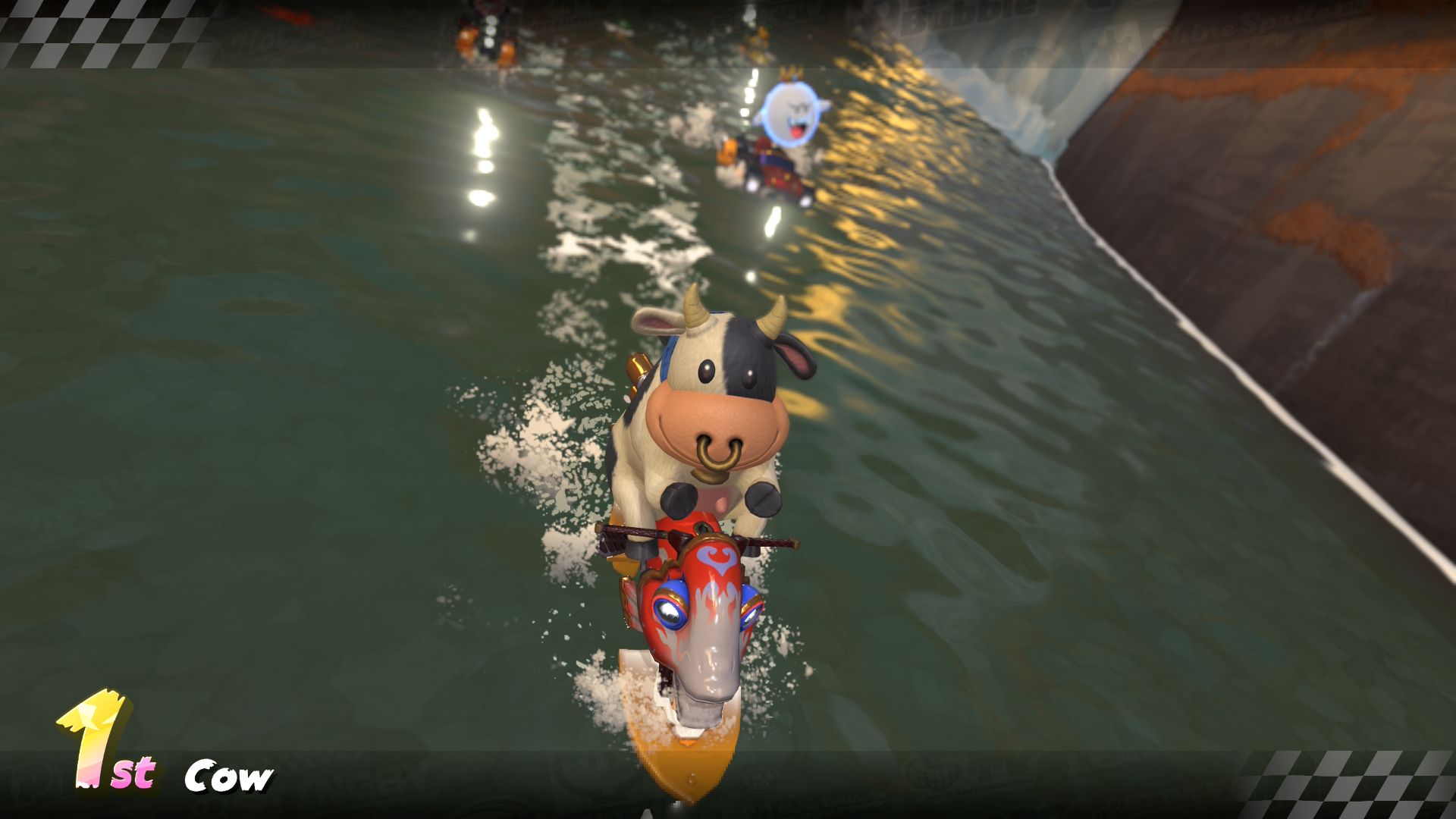 Skoro mamy więcej postaci podczas wyścigu, przydałoby się też trochę nowych bohaterów do wyboru przed startem, prawda? I całe szczęście Wielkie N tu nie zawodzi. Łącznie w grze możemy liczyć aż na 50 postaci, z czego na start dostajemy 32, a pozostałe odblokujemy w ramach rozgrywki. Do tego najbardziej rozpoznawalne twarze serii otrzymują warianty stroju – co przekłada się łącznie na aż setkę alternatywnych ubranek. Super prezentuje się też lista postaci, bo choć większość i tak będzie grała pewnie głównie Mario i Peach, to fajnie zagrać czasami też inną personą, np. taką Krową… Tras, w porównaniu z długo rozwijanym Mario Kart 8, nie jest na razie jakoś zatrważająco dużo – do wyboru mamy 32 trasy, z czego połowę będziecie pewnie kojarzyć z poprzednich odsłon. Trasy są obszerniejsze, to trzeba przyznać, ale i tak chciałbym trochę większego wyboru już od premiery.