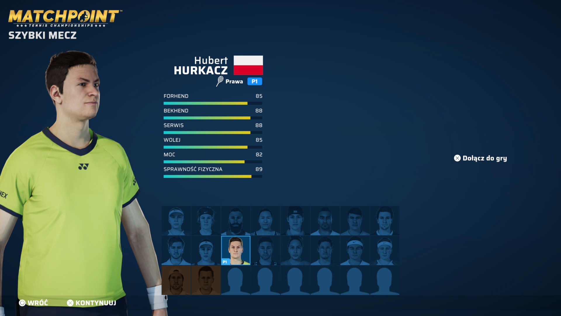 Jeśli już wspominam wizerunki naszych mistrzów, to zacznijmy od kwestii licencji w recenzowanej pozycji. No tu niestety jest dość biednie. Widać, że twórcy dopiero zaczynają i nie chcieli inwestować w grę za dużo pieniędzy, a szczególnie nie w drogie licencje. Nie zagramy tu więc w rozpoznawalnych wielkich szlemach, a tylko w imitujących je turniejach. Jeśli zaś o zawodników chodzi, to w grze spotkamy około 20 licencjonowanych tenisistów, w tym właśnie Huberta Hurkacza. Szału nie ma. Reszta spotkanych zawodników to już fikcyjne postacie. Ci jednak wzięci z realnych kortów pokazują nam się nie tylko ze znajomych twarzy, ale też z rozpoznawalnych strojów.