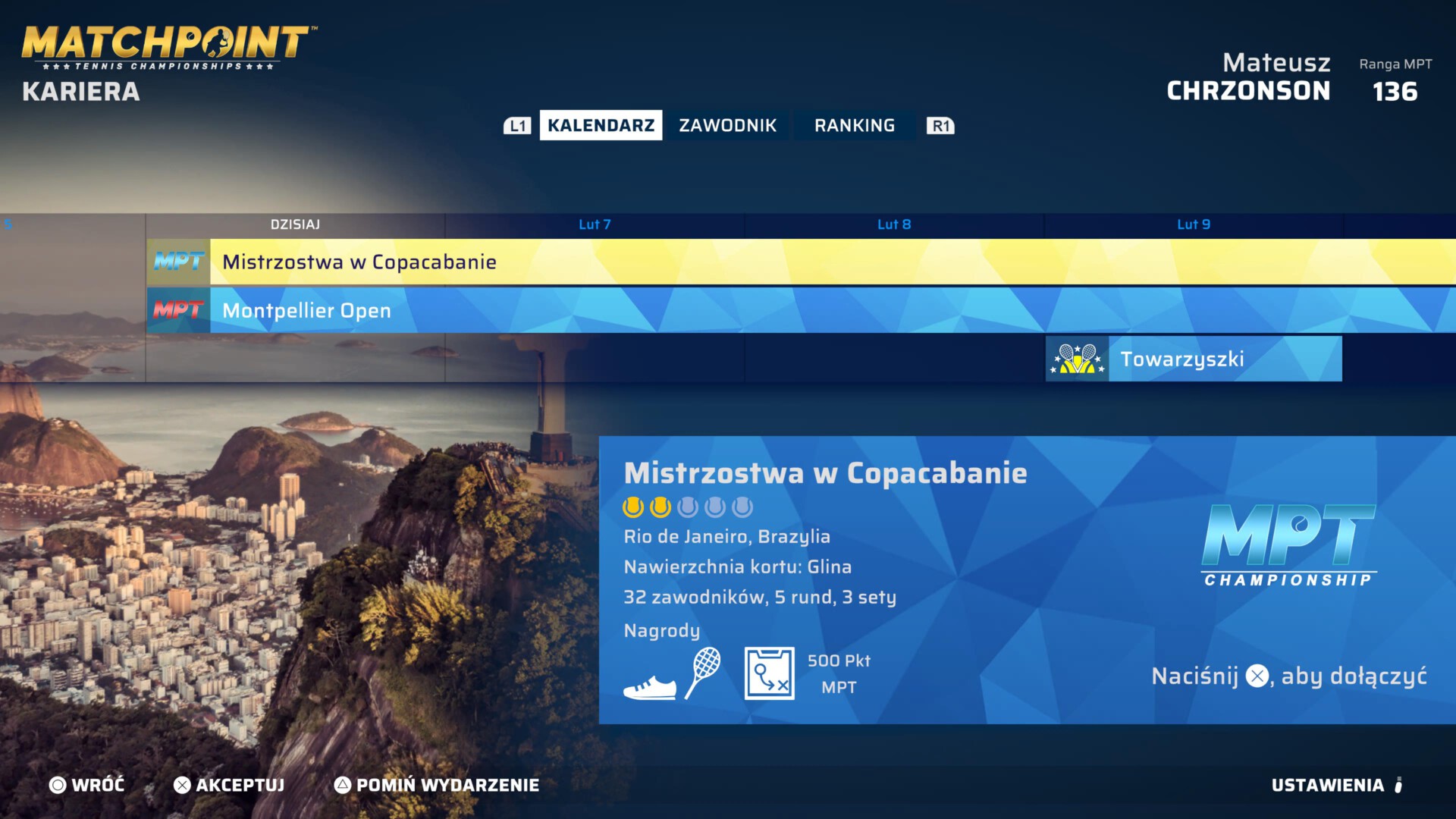 W Matchpoint: Tennis Championships możemy bawić się w pojedynkę, czy to rozgrywając mecze z botem w trybie pojedynczego starcia, czy to ćwicząc na treningach albo też przechodząc tryb kariery. Możemy też zagrać z drugą osobą w trybie kanapowym na splitscreenie lub zmierzyć się z innymi graczami online. Trybów online siłą rzeczy nie miałem jeszcze jak sprawdzić przed premierą, skupię się więc na trybie kariery. Tutaj znajdziecie wszystko to, czego możecie się spodziewać. Rozgrywamy spotkania towarzyskie, bierzemy udział najpierw w mniejszych turniejach (wielkie szlemy wymagają od nas minimum 100. miejsca w rankingu, a zaczynamy w trzeciej setce), trenujemy, podnosząc nasze statystyki, i tak dalej. Za turnieje dostajemy też nowe rakiety, elementy ubioru czy dostęp do innych trenerów. Wszystko to podnosi nasze statystyki. Same turnieje to typowe drabinki i nic więcej – przydałoby się jakieś urozmaicenie, bo kariera niestety dość szybko przez to zaczyna nudzić. Nadal jednak gameplay ratuje sytuację.