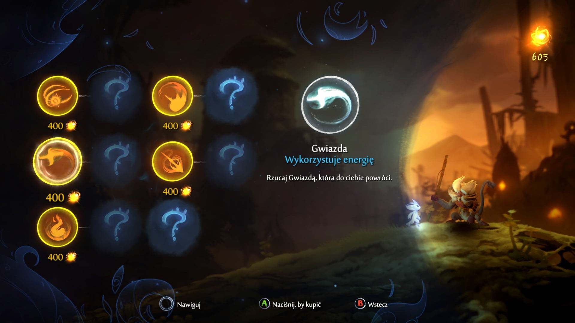 A, zapomniałbym wspomnieć jeszcze o fabule. Ten element nie jest może najważniejszy, ale nie nazwałbym go też zbytecznym dodatkiem. Historia jest bezpośrednią kontynuacją pierwszej części, gdzie przywróciliśmy życie do opanowanego mrokiem lasu. Do ekipy dołącza mała sówka, Ku. Wykluwa się z jaja, rośnie oraz uczy się latać. Taka pierwsza powietrzna podróż wraz z Orim zapędza jednak parę w kłopoty. Przelatują na drugą stronę jeziora, gdzie zastają straszną burzę, co też ostatecznie doprowadza do rozdzielenia sówki i duszka. Ori trafia to zupełnie innego lasu, a ten zdaje być opanowany podobną chorobą, co jego obecny dom lata temu. Tak wiec mały leśny duszek rusza w podróż w celu odnalezienia Ku, przy okazji pomagając tamtejszym mieszkańcom. Ta prosta historia ma sobie naprawdę dużo uroku i sporo wzruszających momentów. I mimo wszystko nie jest banalna. Do tego muszę jeszcze wspomnieć o zamieszkujących las Mokich, czyli małpopodonych stworkach, które są niezwykle słodkie. Ciekawie wykreowanych mieszkańców znajdziemy tu naprawdę sporo.