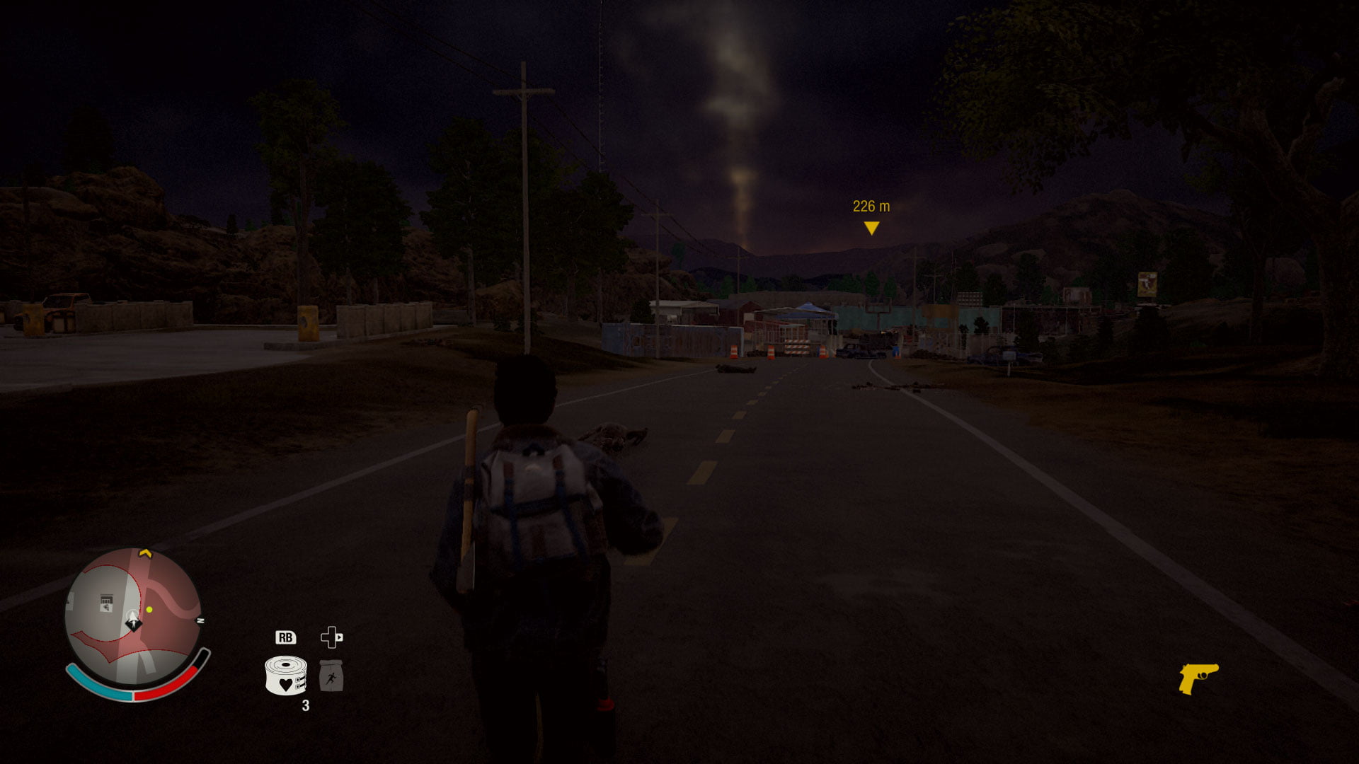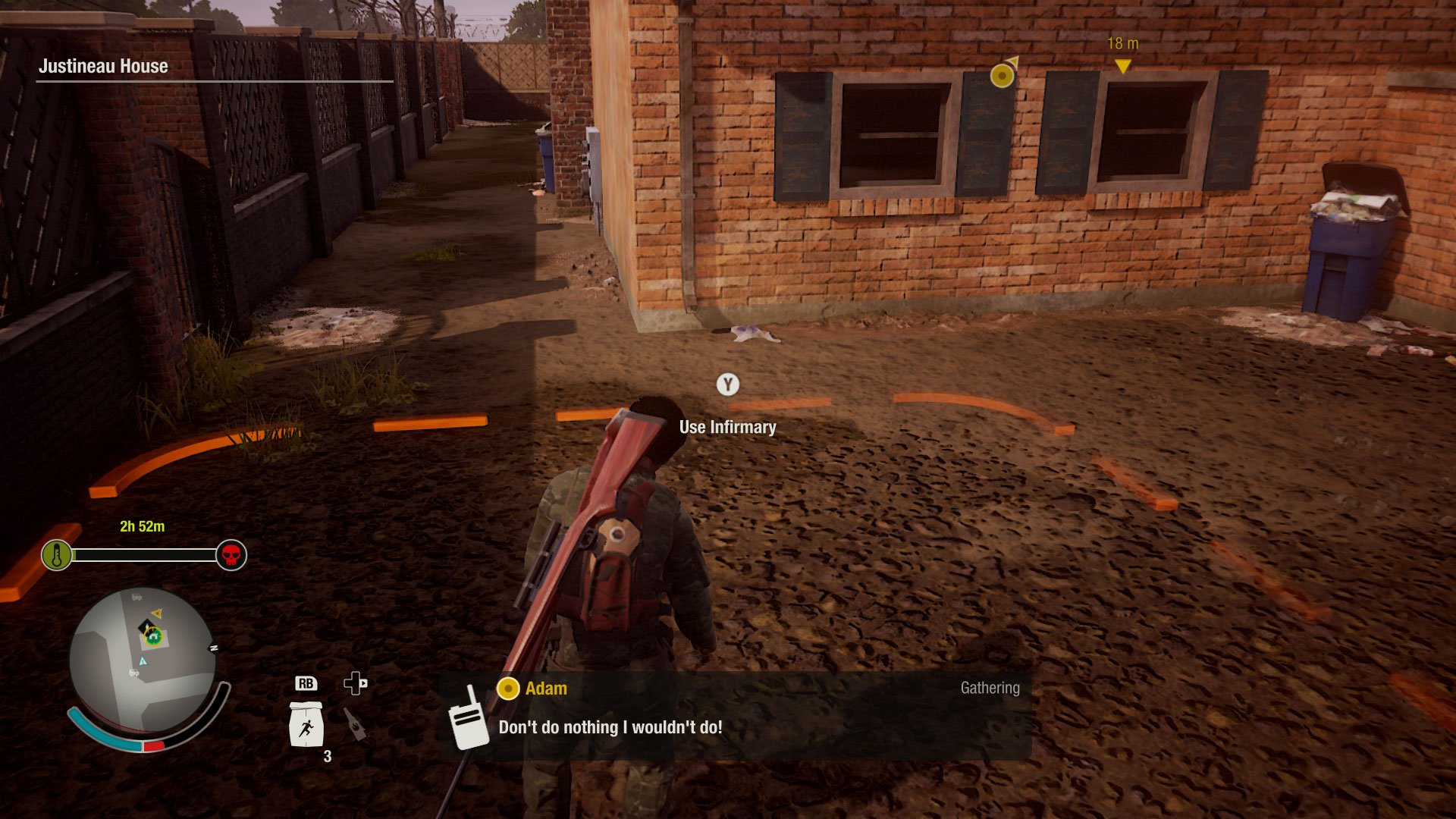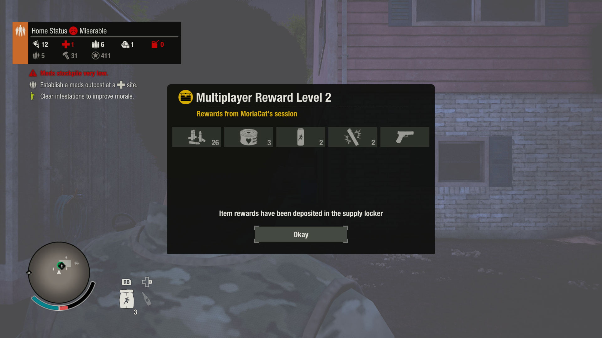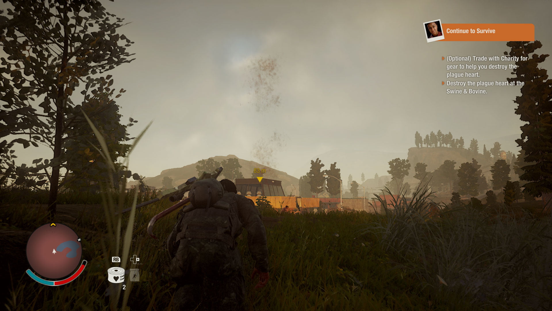 Może i brzmi groźnie na pierwszy rzut oka, a przynajmniej brzmi poważnie, to tak naprawdę, to są te momenty, gdy ładujemy się z wybranym kompanem (bo możemy sobie wybrać z kim chcemy iść, czasem będzie to ktoś z naszej osady, czasem po prostu z innej społeczności, z którą żyjemy w zgodzie) do auta, zabierając jedynie najbardziej potrzebne rzeczy. Mamy plecak, w plecaku kilka zaledwie slotów. Amunicja czy przekąski się grupują, ale wszystko inne już nie. W dodatku możemy zabrać tylko jedną torbę zawierająca amunicję, medykamenty albo jedzenie. Gdy plecak się przepełni (a oprócz miejsca trzeba też pilnować jego wagi), możemy zrzucić go do auta i wziąć kolejny, by jeszcze trochę przegrzebać okolicę. Jest to element z jednej strony utrudniający rozgrywkę. Irytuje on przede wszystkim wtedy, gdy musimy podjąć decyzję, czy lepiej wziąć nowy karabin i amunicję do niego, czy surowce, które posłużą do budowy łazienki. Z drugiej strony dodaje to grze realizmu — nie ma opcji, żeby biegać sobie radośnie po polu i zbierać wszystko, bo mamy jeszcze miejsce na 3 rzeczy, nie, trzeba uważać. Jeśli przesadzimy z wagą nasza postać po pierwsze zwolni, po drugie będzie szybciej się męczyć, więc dla własnego dobra lepiej tego nie robić za często.