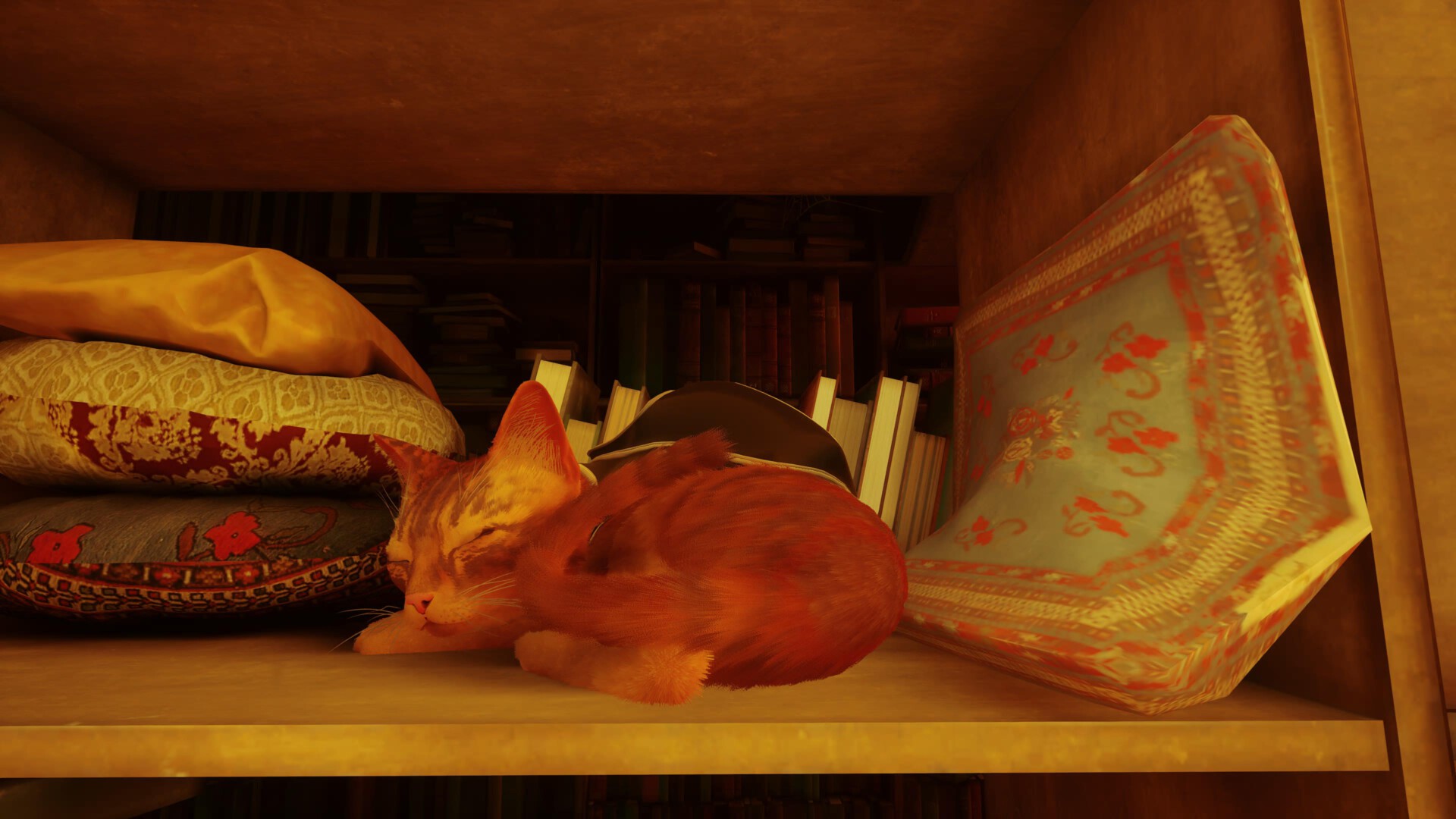 I pozostańmy na moment przy ostatnim podpunkcie, bo jeżeli ktoś jest posiadaczem PlayStation 5 i kontrolera DualSense, to czeka go super zabawa. Wciskając kółko na padzie, nasz protagonista zacznie pomiaukiwać, co będziecie mogli wyraźnie usłyszeć! A to dzięki umieszczonemu w padzie głośniczkowi! Dzięki niemu będziemy mogli usłyszeć naszego kotka i poczuć się jakby ten leżał Wam na kolanach. Za pomocą triggerów będziecie mogli podrapać w drzwi, meble lub dywan. A jeżeli będziecie chcieli się zdrzemnąć, to wystarczy znaleźć wygodną poduszkę, a nasz kot zacznie wtedy ze szczęścia mruczeć przez sen.