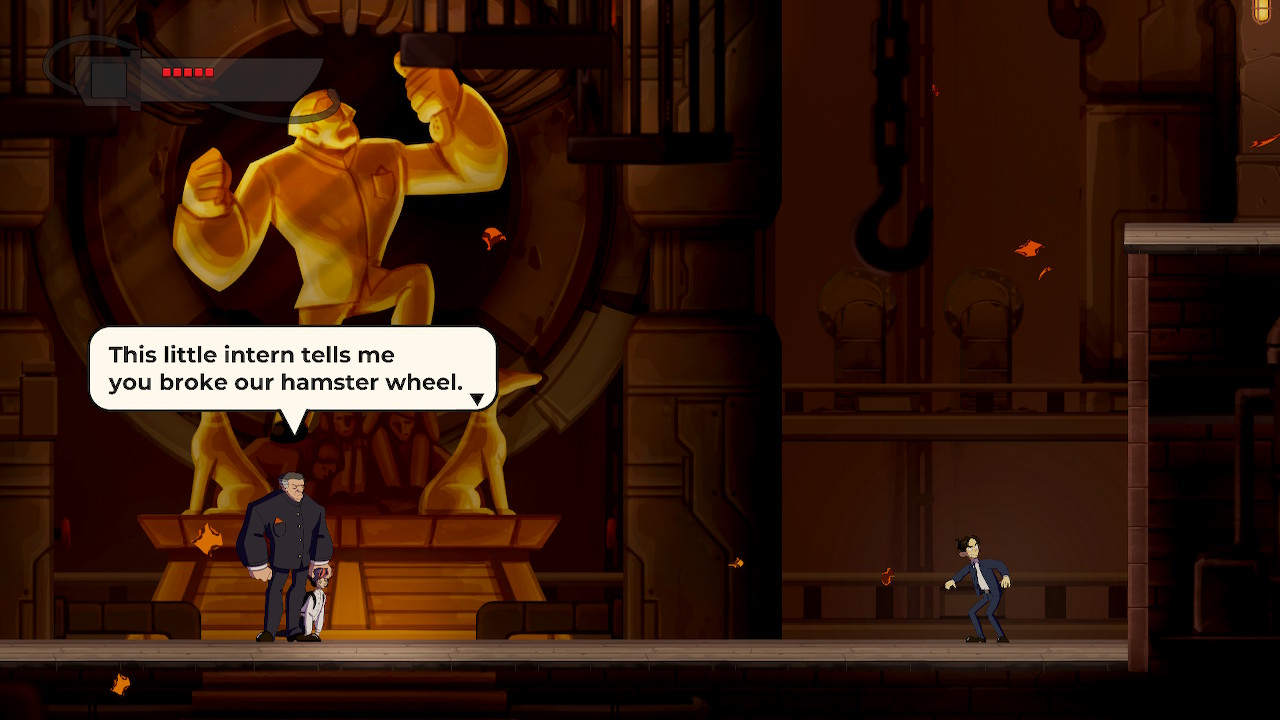 Główne założenia gameplayowe są tu proste do bólu – jest to rasowy platformer 2D, gdzie przechodzimy przez kolejne etapy, a po drodze pokonujemy coraz to nowych i trudniejszych wrogów. Za naszą broń od początku służy klawiatura, która wymachujemy i kładziemy kolejnych omamionych przez korporację nieszczęśników. Potem dostajemy jeszcze blaster wystrzeliwujący maile – ten z czasem dostaje nowe ataki. Pod tym względem gra szczególnie się nie wyróżnia i niczym nie zaskakuje. Z czasem elementy platformowe robią się wręcz powtarzalne, mimo że gra to jakieś 4 godziny zabawy. O wiele ciekawiej wypadają miejscówki i przeciwnicy. Lokacje bezpośrednio nawiązują do etapu, który przechodzimy – na przykład w dziale obsługi klienta widzimy pozamykanych w klatkach niewolników, którzy są zmuszani do pracy. W dziale HR możemy spotkać agresywne księgowe, które zioną ogniem. Menadżerowie to często gnębiący stażystów tyrani, którzy wykorzystują ich jako mięso armatnie i tak dalej. Trzeba pochwalić za pomysł i sporą dozę humoru.