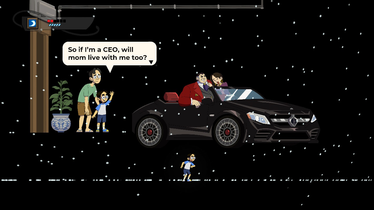 The Company Man od początku przyciąga wzrok piękną oprawą graficzną, a na pierwsze miejsce wysuwają się ładnie rysowanie postacie oraz tła, które w zestawieniu z pomysłowością twórców robią spore wrażenie. Do tego dochodzą oszczędne, ale urzekające animacje, przywodzące na myśl klasyki gatunku platformówek czy przygodówek point and click – szczególnie podoba mi się sposób biegu głównego bohatera. Muzycznie raczej ciężko coś tu wyróżnić, bo głównie przygrywają nam powtarzające się, rytmiczne brzemienia, które mimo wszystko pasują przede wszystkich do wspomnianych animacji.