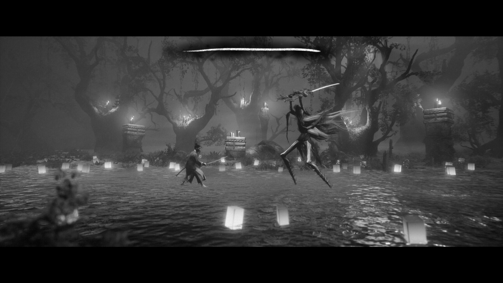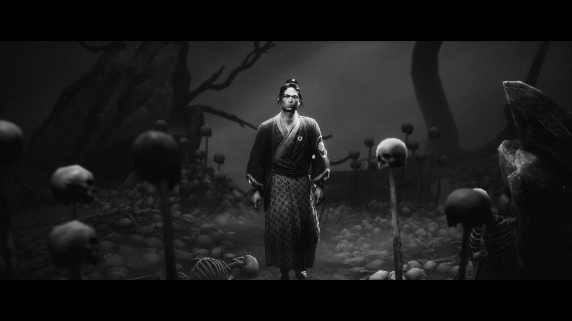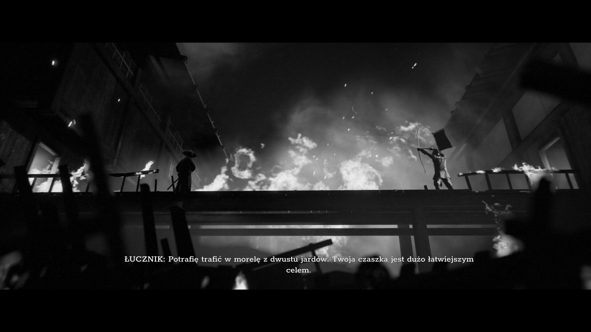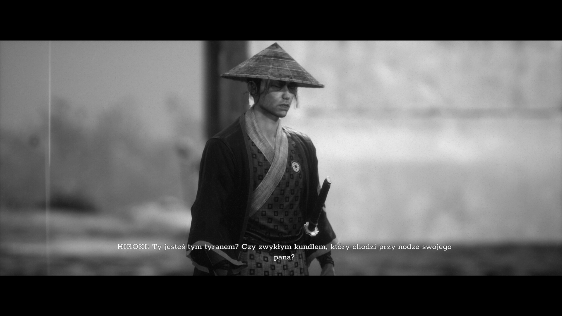 Poza historią największe wrażenie zrobiła na mnie oprawa audiowizualna. Ta przykuwała oko graczy od pierwszych zapowiedzi, a podczas rozgrywki robiła jeszcze lepsze wrażenie. Już podczas pierwszych minut z grą zachwycał styl rodem z filmów Kurosawy, i nie mówię tu tylko o czarno-białej stylistyce. Doświadczymy tu filtrów stylizujących na klasyki kina, jak charakterystyczne „skazy” taśmy filmowej – typu grube ziarno, migające, jasne artefakty czy trzaski dźwiękowe. Od pierwszej chwili poczułem się jak podczas seansu Siedmiu samurajów czy Straży przybocznej lata temu – brakowało tylko szalejącego na ekranie Toshiro Mifune. Dalej też mogliśmy doświadczyć podobnych odczuć, na przykład podczas charakterystycznych głośnych i zniekształconych dźwięków otoczenia (szczególnie podczas szalejącej wichury). No i oczywiście duży plus za dubbing wykonany w całości przez japońskich aktorów głosowych. Zwyczajnie wszystko jest tu dopięte na ostatni guzik, przez co nic nie wytrącało z poczucia bycia częścią kina samurajskiego ze złotego okresu. Okej, jakbym miał się do czegoś przyczepić, to byłyby to trochę drętwe animacje walk i poruszania postaci, które stawały się zauważalne w lokacjach z bardziej przybliżoną kamerą. Ale to taki szczegół.