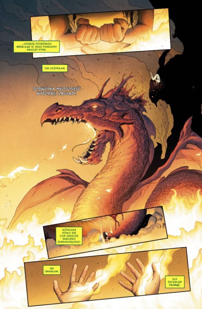 Dostajemy też kolejny rozdział z historii członków pierwszego, prehistorycznego składu Avengers. Tym razem Aaron przedstawia opowieść o pierwszej Żelaznej Pięści. Całość oscyluje na granicy heroic fantasy, ale pojawiają się znane elementy ze świata Marvela. Zeszyt ten jest raczej przerywnikiem i liczę na losy następnych bohaterów, choć nie oczekuje, iż będzie to kolejna wersja znanego herosa w nowym wydaniu. Na tym motywie Aaron oparł de facto cały swój run, bo czymże jest Zimowa Gwardia i inne zespoły (do których w tym tomie dołącza wampirzy team), jeśli nie jedną wielką wariancją na temat Avengers?