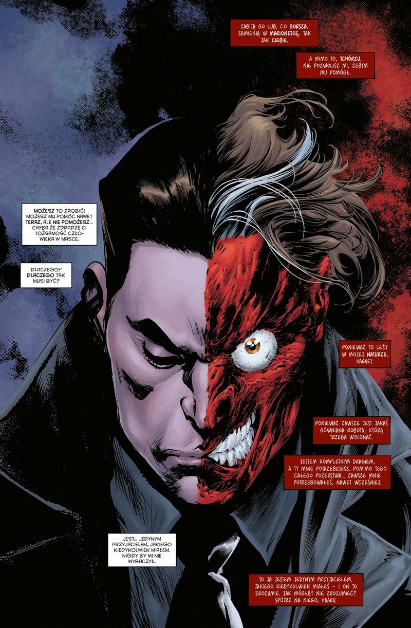 Two-Face to więcej niż tylko dwie twarze. Jakoś nigdy nie udało mu się wybić ponad Jokera, a czasem nawet puszczał przodem Riddlera. Tutaj jednak Dent ma sporo do powiedzenia. Czy może raczej – mają. Osobowość Harveya toczy bój z mrokiem Two-Face’a. Przeciwnikiem nie jest tym razem Batman, a Orghamowie. Mroczni rojalsi przecenili w jego przypadku swoje możliwości, choć nadal mają kły i pazury mogące rozedrzeć Człowieka o Dwóch Twarzach.