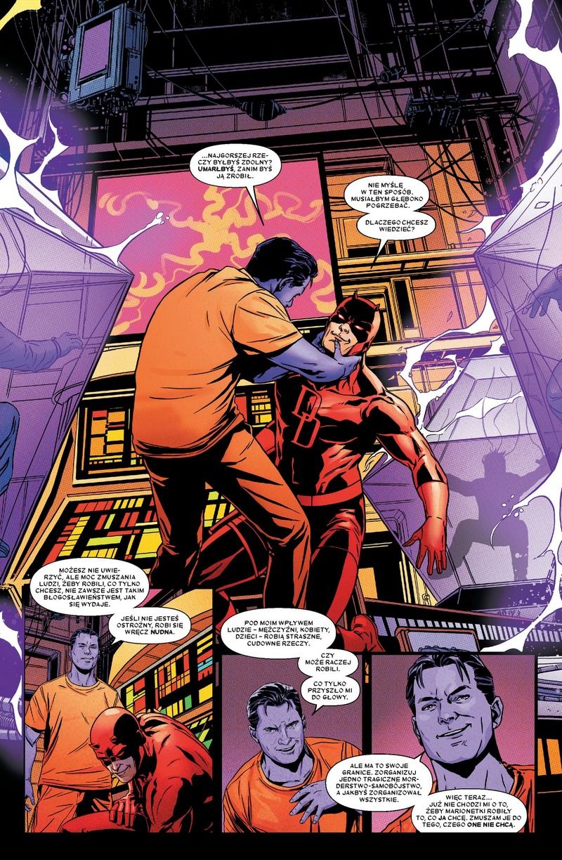 Kilka słów na początek. Charles Soule zastąpił Marka Waida, rozpoczynając zupełnie nowy story arc, niewiele wyjaśniając w pierwszym tomie. Co sprawiło, że Daredevil wdział nowy strój? Gdzie Kristen McDuffie i czemu nikt nie pamięta sekretu Murdocka? Scenarzysta w rozbudowany sposób odpowiada w tym albumie, a przy okazji przedstawia postać dość krewkiego kapłana, na którego powrót liczę. Dostajemy tu psychologizującą opowieść ze Śmiałkiem w roli głównej, gdzie autor zamknął niekończący się wątek tajnej tożsamości Matta. Bądźmy szczerzy – czy odgrzewanie tego kotleta miało już jakikolwiek sens? Tym bardziej, że nowa ścieżka to pretekst do śmiałych rozwiązań fabularnych.