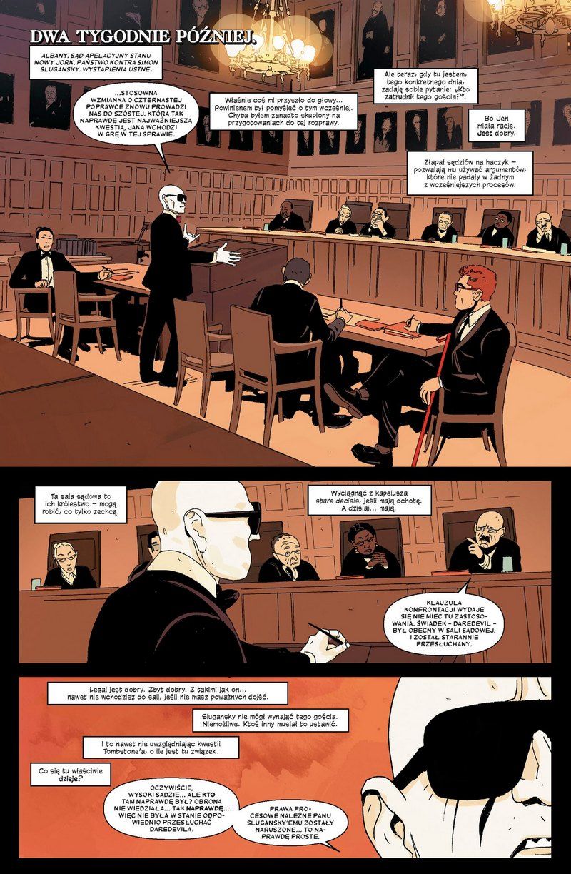 Ekscesy z rozdwojeniem zawodowym Daredevila pojawiały się już wielokrotnie. Od albumu Daredevil: Odrodzony Franka Millera, poprzez cały niemal run Bendisa, aż do Charlesa Soule’a. Przez cały ten czas, niczym diabeł z pudełka, wyskakiwało spięcie między hasaniem po NY w czerwonym trykocie, a intratną posadką prawnika. Daredevil – Znowu w czerni tom 2 zaskakuje w tej kwestii, a sam Murdock staje przed obliczem Sądu Najwyższego USA. Tym razem nie za swoje grzechy.