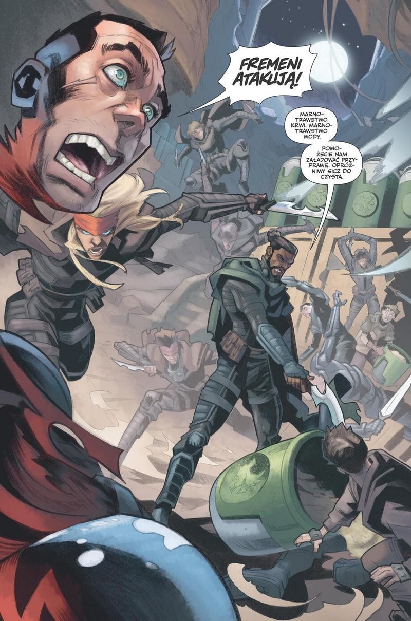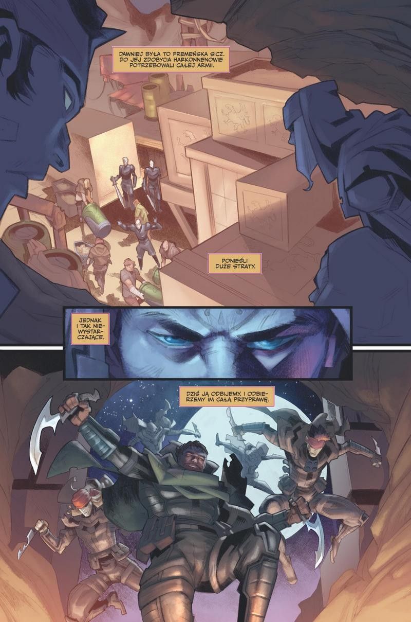 Czas i miejsce akcji zmieniają się nieznacznie względem poprzednich serii. Wszystkie detale pozostają więc te same i Ragazzoni nie sili się na autorskie wizje. Harkonnen jedynie przybiera na masie, a Szaddam mógłby stać się ikonicznym buńczucznym władcą. Nowością jest Tyros Raffa, przybrany brat Imperatora, który gdzieś tam budzi moje skojarzenia z postaciami Marvela lat 90.. W pozostałych kwestiach rysownik pozostaje konserwatywny, choć warto pochwalić go za ciekawy styl pozwalający pchnąć akcję do przodu. Artysta dobrze radzi sobie też ze skrajnie różnymi wątkami. Od kryjących się w cieniu Bene Gesserit, poprzez imperatorskie sale, aż po dwór Atrydy, gdzie niemal w pełni zcyborgizowany Rhombur Vernius wygląda przyjaźnie.