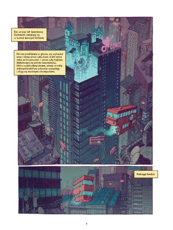 Największym złem nie są więc problemy społeczne, a Kanibal. Pościg za nim to wartka akcja, ale też wnikliwe śledztwo. Wszak może i jest on potworem, ale rozumnym i choć jego ambicje są konsumpcyjne, to motywacja napędzana jest nie tylko apetytem. Wszystko unurzane jest w czarnym humorze, który trafi do fanów absurdu i kulturowych powiązań. Dystopolis to bowiem prawdziwy kocioł wielu motywów, w których można wypatrzeć wielopoziomowość przestrzeni miejskiej i estetykę Piątego elementu. Do tego samo miasto robi wrażenie równie wielkie, co metropolie z Blade Runnera czy Akiry. Choć nie jest tu aż tak deszczowo, a Vandepitte stawia na mnogość kolorów raczej niż ponure barwy.