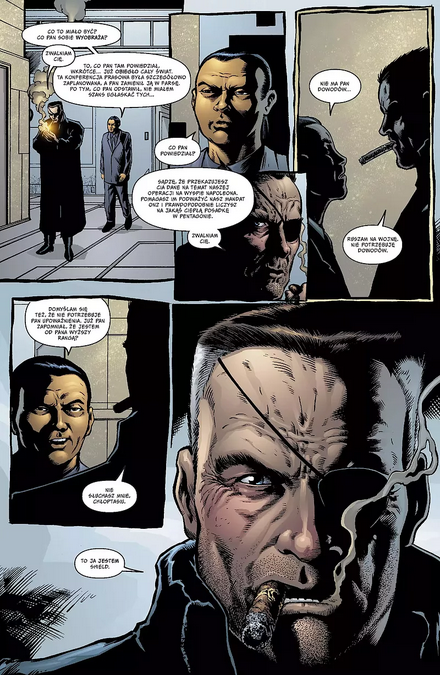 Fury do imprintu Max trafił w 2001 roku, na początku jako sześciozeszytowa miniseria. Jako że zawarte w niej opowieści są oderwane od głównej linii czasowej Marvela, Ennis mógł pozwolić sobie w zasadzie na wszystko. Nie było żadnych granic, a efekt końcowy wywołał niemałe kontrowersje. Samego Fury’ego w pierwszej historii uczynił emerytem-weteranem, zagubionym w świecie bez wojny. Brakuje mu akcji, brakuje mu przemocy, a S.H.I.E.L.D., którym kiedyś niezmordowanie dowodził, nie jest już tą samą organizacją. Ennis uczynił tu Nicka postacią wyjątkowo antypatyczną, wręcz miewającą myśli o mordowaniu niewinnych, zdolną wywołać konflikt zbrojny, w którym będą ginąć ludzie, tylko po to, by przerwać pasmo nudy. Nie do końca podoba mi się takie ujęcie tej postaci.