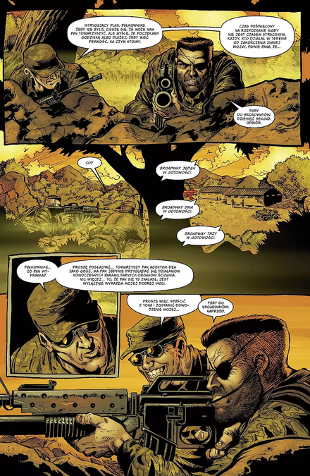 To tak brutalna odsłona serii, że swojego czasu nawet Stan Lee krytycznie odnosił się do jej zawartości. Krąży też legenda, że opowieść Ennisa odstraszyła samego George’a Clooneya od wcielenia się w Nicka Fury’ego w kinowej ekranizacji. Najwyraźniej sygnały te nie pozostały bez wpływu na twórczość scenarzysty, bo napisany w 2006 roku prequel Fury: Peacemaker, również zawarty w Fury Max tom 1, ma już nieco inny wydźwięk. W o wiele bardziej realistycznej, osadzonej podczas II wojny światowej opowieści nadal znajdziemy dosadną przemoc, ale już nie groteskową czy obsceniczną. Wszelkiego rodzaju akty brutalności służą tutaj wyłącznie do pokazania piekła wojny, a i sam Fury jest tutaj postacią jaką znamy – niezłomnym, waleczny, dzielnym żołnierzem, któremu przyświeca bardziej szlachetny cel.