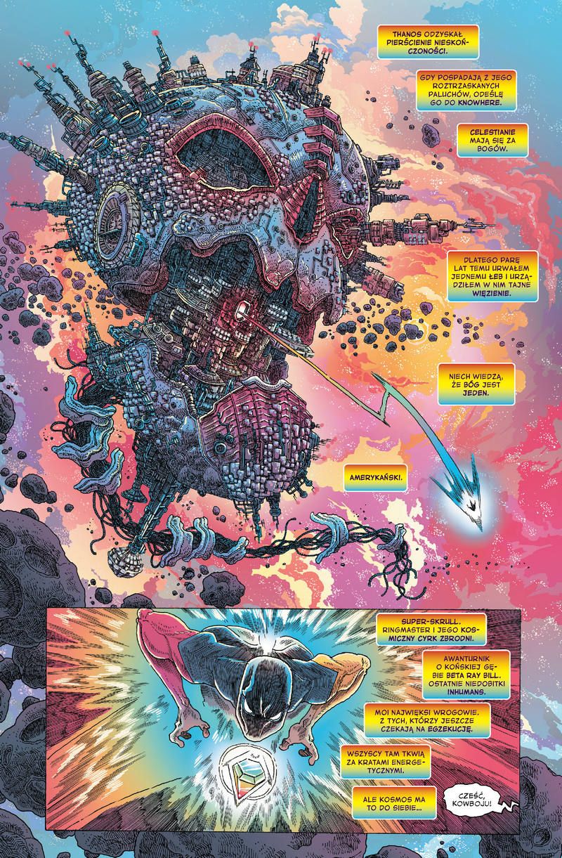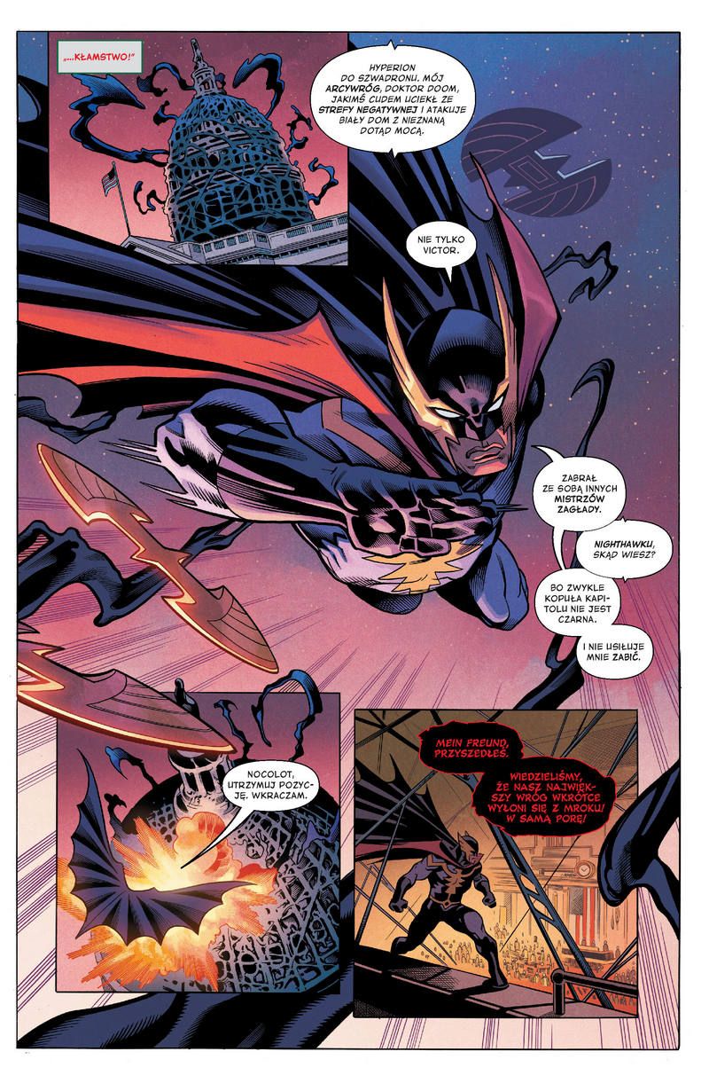 Amerykański Szwadron Sztandarowy to, podobnie jak Siódemka z Chłopaków, grupa inspirowana Ligą Sprawiedliwości. W przeciwieństwie jednak do teamu Homelandera nie wszyscy są tu degeneratami, ale daleko im do ideału postaci z DC. Aaron ukazuje grupę jako potężną i pomnikową, ale niepozbawioną skaz i w swojej naturze bliższą rządowej bojówce niż grupie herosów. Ten, kto uważnie śledzi jego Avengers, zapewne domyśli się, kto stoi za nagłą zmianą świata. I tym razem nie jest to Onslaught.