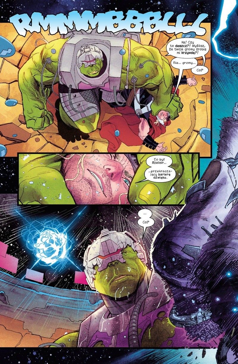 Donny Cates jest tu trochę jak dorosły, którego stać na wymarzone zabawki z dzieciństwa. Bo który fan Marvela nie chciałby napisać historii starcia Hulka z Thorem? Ma to swoje plusy. Jest epicko, we współczesnym tego słowa znaczeniu. Panowie dają sobie po gębie na kosmiczną skalę i biada tym, którzy znajdą się w pobliżu. Cały album to rozbudowany pojedynek, rosnący geometrycznie w zaskakujących kierunkach, gdzie głównymi zawodnikami są mimo wszystko postaci pozytywne, nieco tylko przybrudzone szarością. Czasem autor swoimi szalonymi pomysłami ociera się o przerost mocy nad treścią. I jak zwykle to z nim bywa, znów w ostatnim momencie wyhamowuje przed przepaścią.