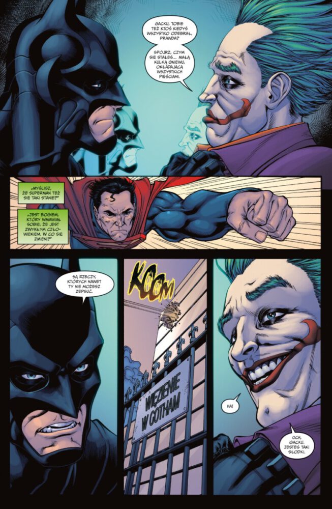 Wszystko zaczyna się od Jokera. Przypisywany do Gotham arcyłotr nie uderza w Batmana, a w Supermana. I zdawać by się mogło, że Kal-El zdmuchnie klauna bez trudu, lecz siłą łotra jest jego złowieszczy umysł. A Superman zdecydowanie gorzej radzi sobie z psychologicznymi gierkami niż Mroczny Rycerz. W efekcie globalnej i osobistej tragedii Ostatni Syn Kryptona zmienia się radykalnie i choć nie dostajemy banalnego pójścia w bycie złym, to dawny kodeks dobrego harcerza z gaciami na wierzchu idzie w zapomnienie.