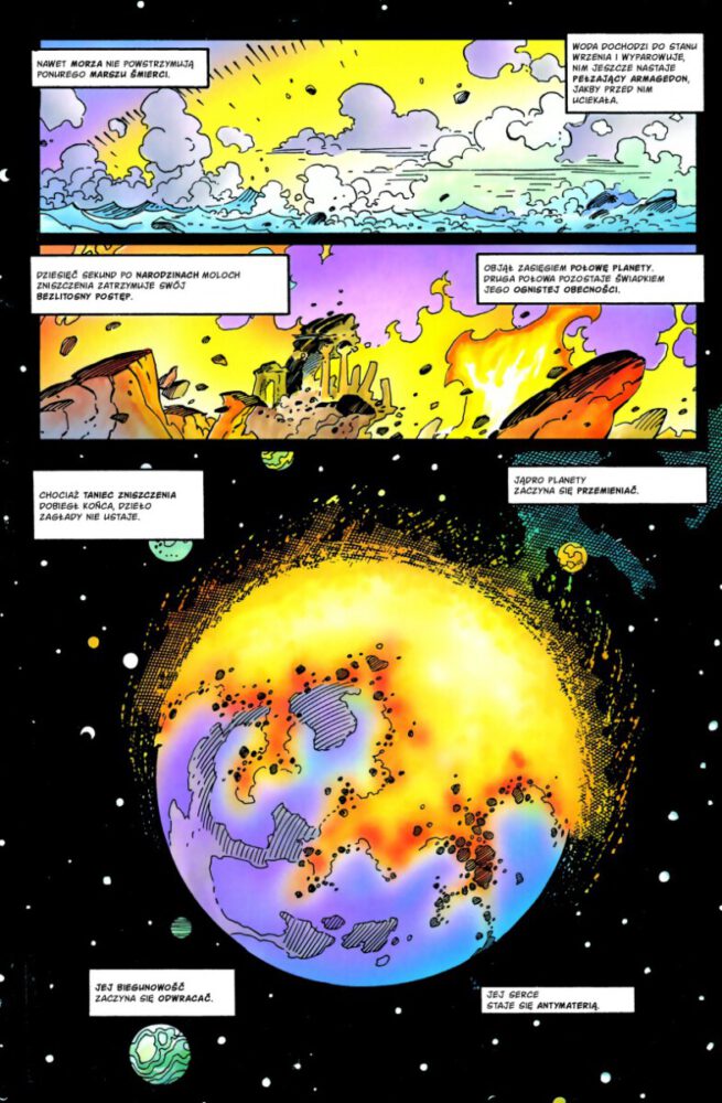 Pozaziemska część DC ma na polskim rynku znacznie mniejszą reprezentację niż kosmos Marvela. Szkoda, bo choć zbudowana jest na innych podstawach, to ma do zaoferowania równie wiele, zwłaszcza gdy weźmiemy pod uwagę Czwarty Świat, przejaw geniuszu Jacka Kirby’ego, do którego należą między innymi Darkseid czy Mister Miracle. Kosmiczna odyseja to ukłon w stronę tej części uniwersum i jego twórcy, napisany przez Jima Starlina, który dla konkurencji stworzył kultową Sagę nieskończoności, i narysowany przez Mike’a Mignolę, kojarzonego co prawda częściej z mrokami Hellboya, który również bywał jednak wśród gwiazd, między innymi w solowej serii Szopa Rocketa. Z tymi autorami i w tej konwencji nie mogło się więc nie udać.